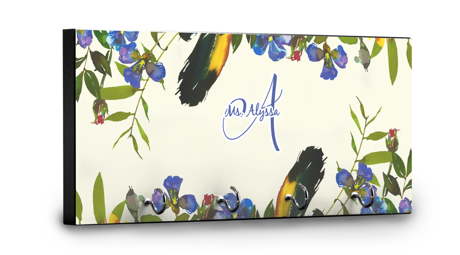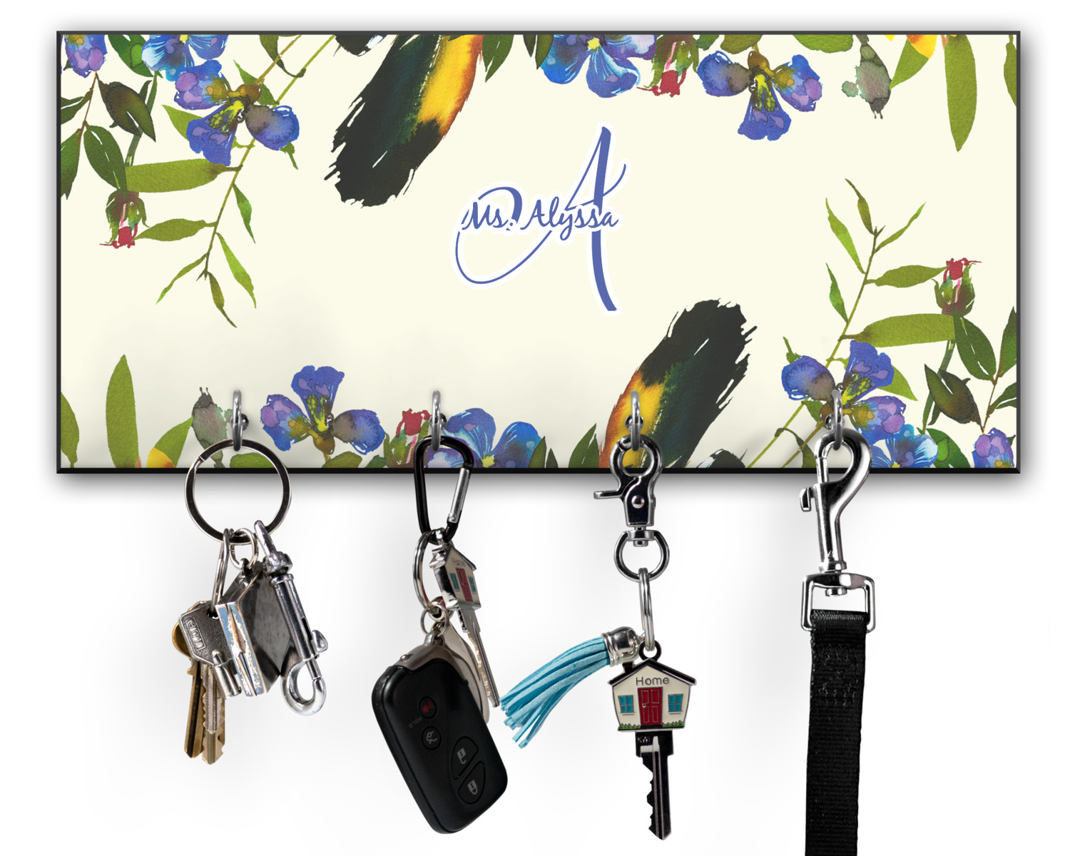 This 11" x 5" key hanger is made of sturdy wood and has four metal hooks lining the bottom. This is the perfect size for a family with several drivers. Not only can you hang keys on it though, but pet leashes and other small items. The board is black on the sides and back and is printed with the design of your choice on the front.