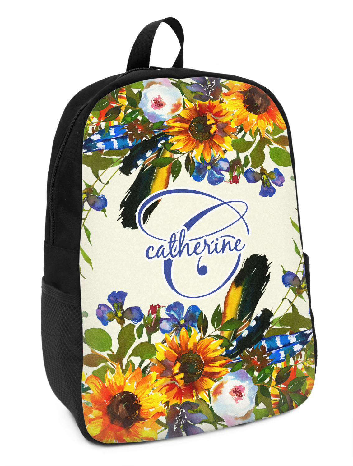 These small backpacks are made of a durable black canvas material with your personalization right on the front. The two shoulder straps are padded and easily adjustable. The bag itself measures at about 11" W x 15" H x 5" D. It's the perfect size for elementary aged kids or adults who want a smaller backpack. On the top of the bag you will find a handle to hang or carry your backpack by as well as a large zipper closure to keep all of your belongings safe inside. On each side of your backpack is a mesh pocket for a small item or water bottle. Inside your backpack you will find a spacious area with a small zipper pocket and a padded laptop slot that will fit up to a 13" laptop (13" being very snug). This is the perfect bag for any student that needs a couple books and their laptop with them at all times. It also works great as a carry on for traveling!