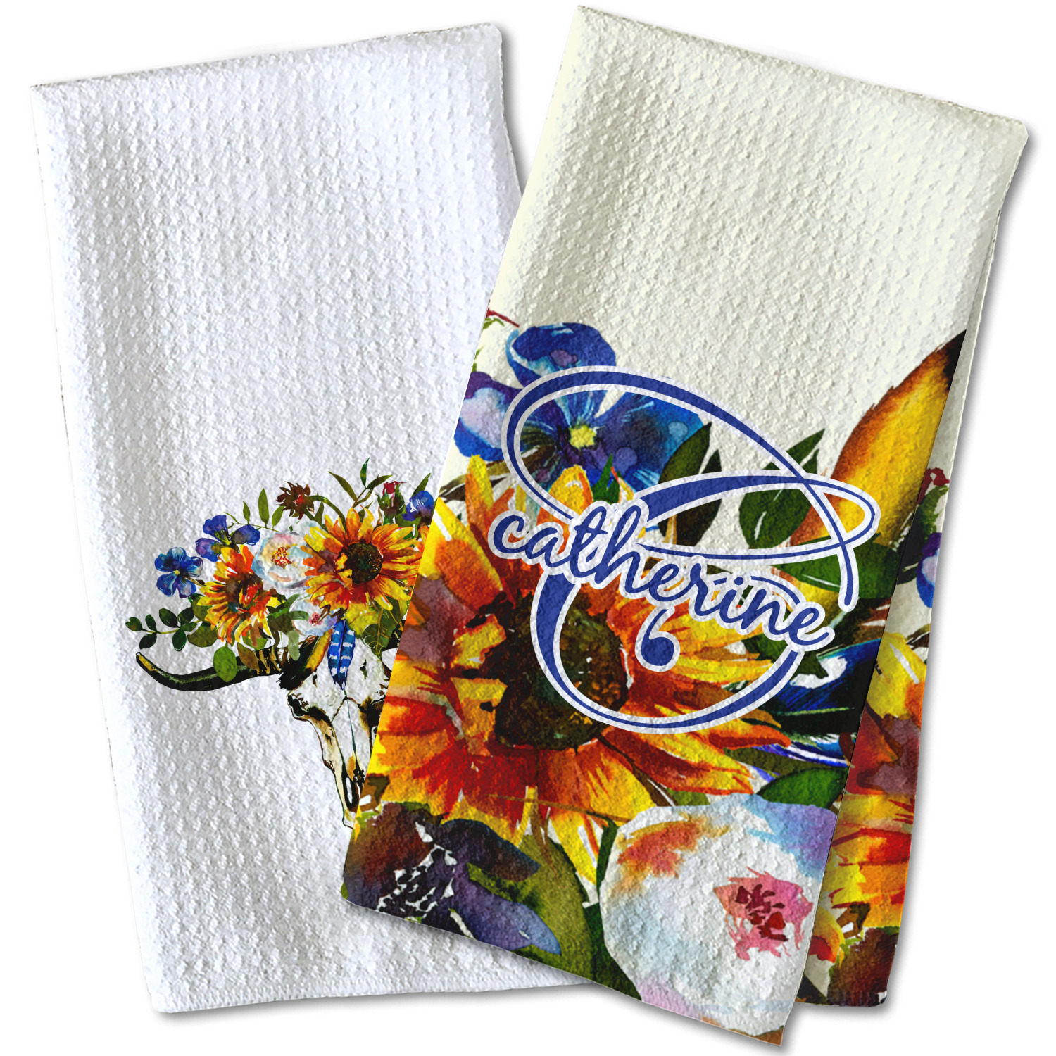 Each waffle weave kitchen towel is approximately 16 x 24 inches with your design printed on one side and the back is white.