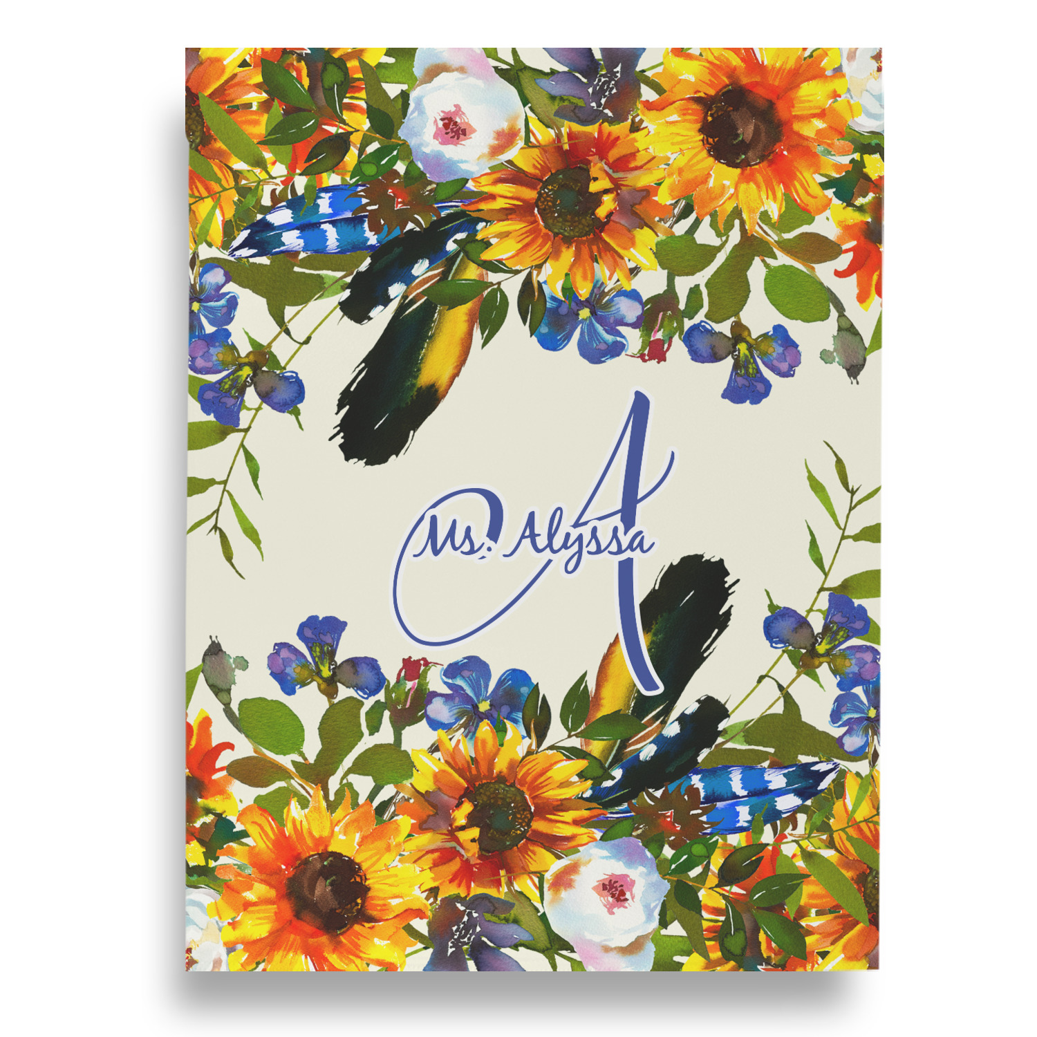 This sunflowers design template is simply beautiful. We chose to personalize it with a name & initial for the main design. We used the blue from the flower in the design and a really pale yellow background.