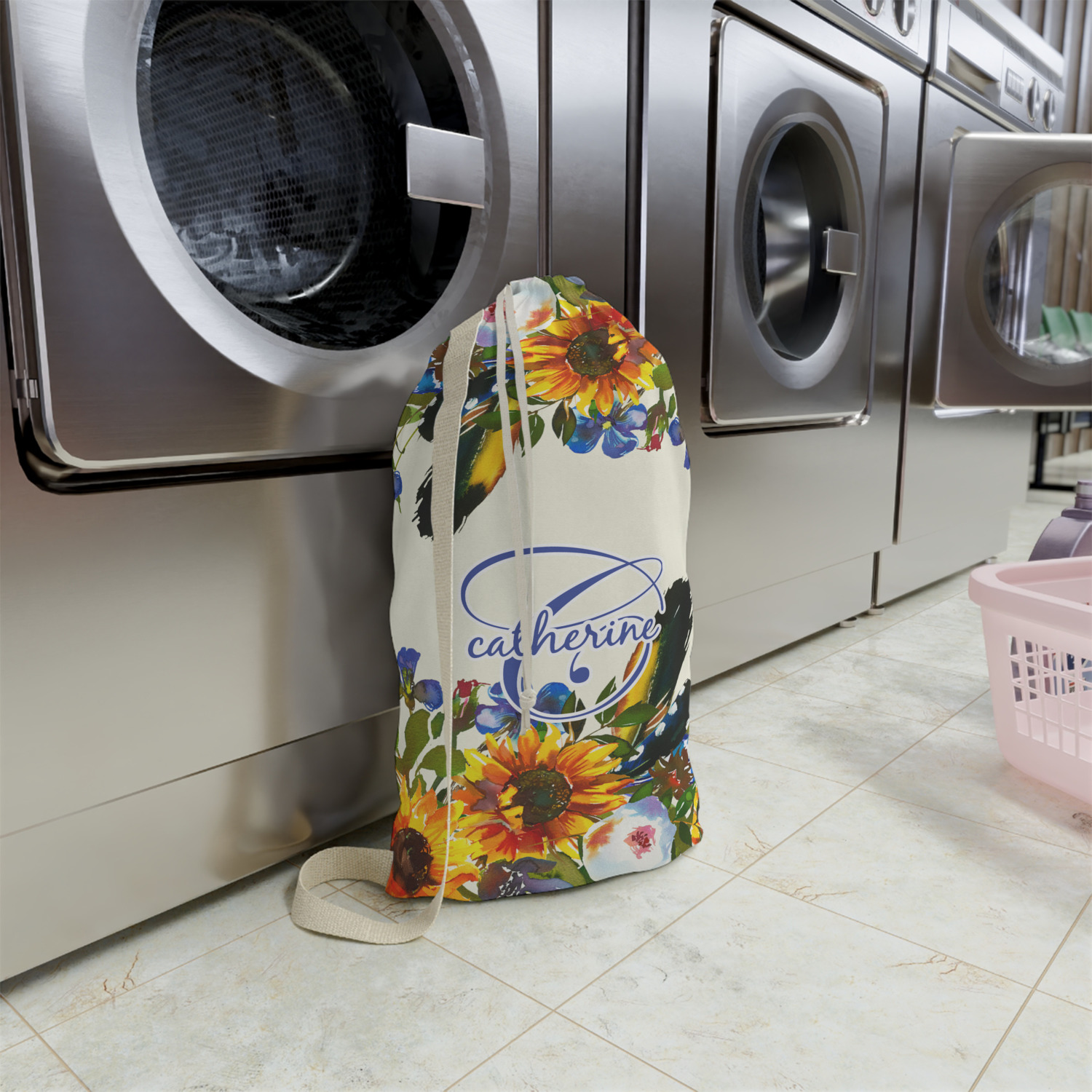 Carry your laundry in style with these customized laundry bags. Available in two sizes, featuring a natural colored woven strap and a cinch cord, these bags hold a lot of clothes or anything else you want to fit in them.