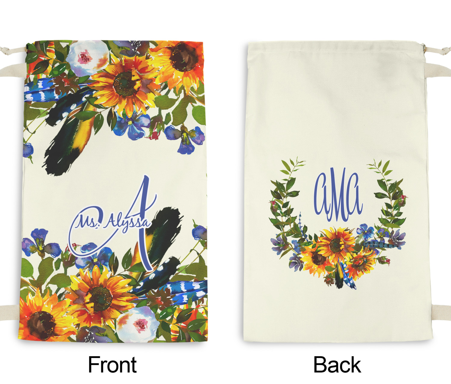 Carry your laundry in style with these customized laundry bags. Available in two sizes, featuring a natural colored woven strap and a cinch cord, these bags hold a lot of clothes or anything else you want to fit in them.