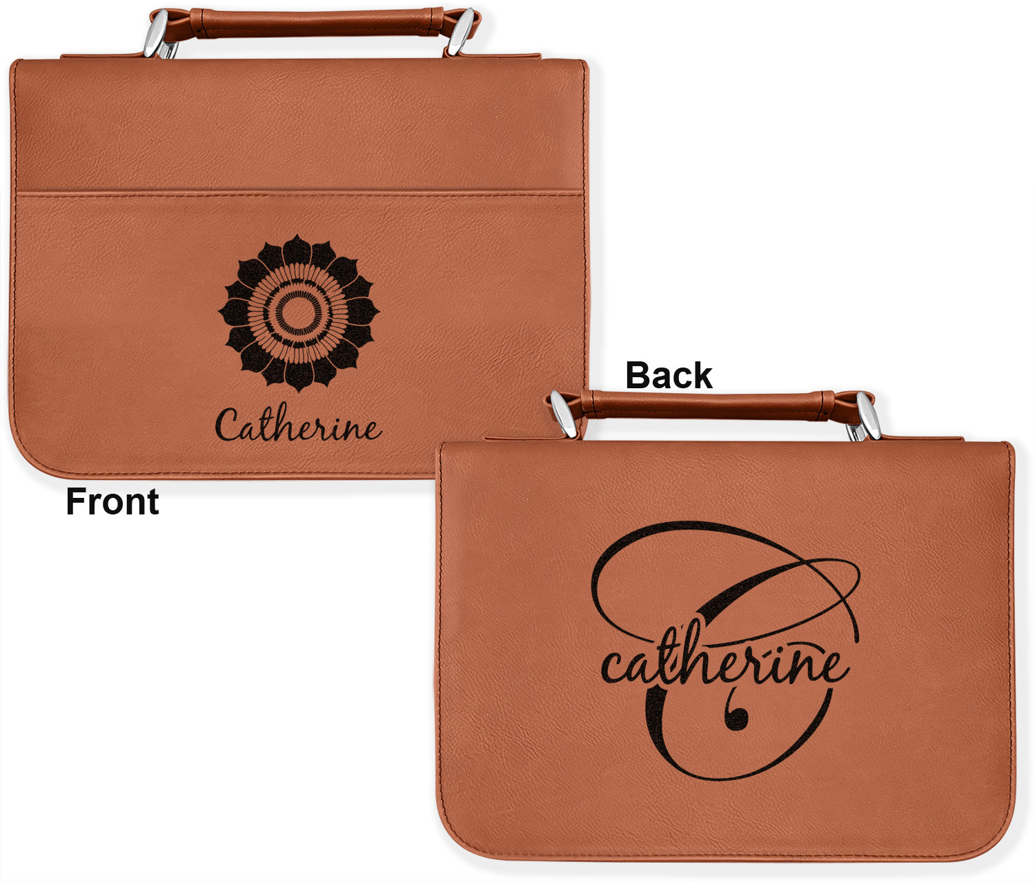 These book covers are fabricated from a fine leatherette in a warm, cognac shade of brown. A wide pocket spans across the front of the book jacket [2,400] and can store any loose papers or notes that you wish to keep. The interior of this personalized Bible cover includes slots on both sides to house the covers of your Bible, and keep it in place. The inside of the spine has a small elastic band to secure a pen. A zipper lines three sides of the cover, while the fourth side features a reinforced handle that allows for easy transport of your enclosed book.