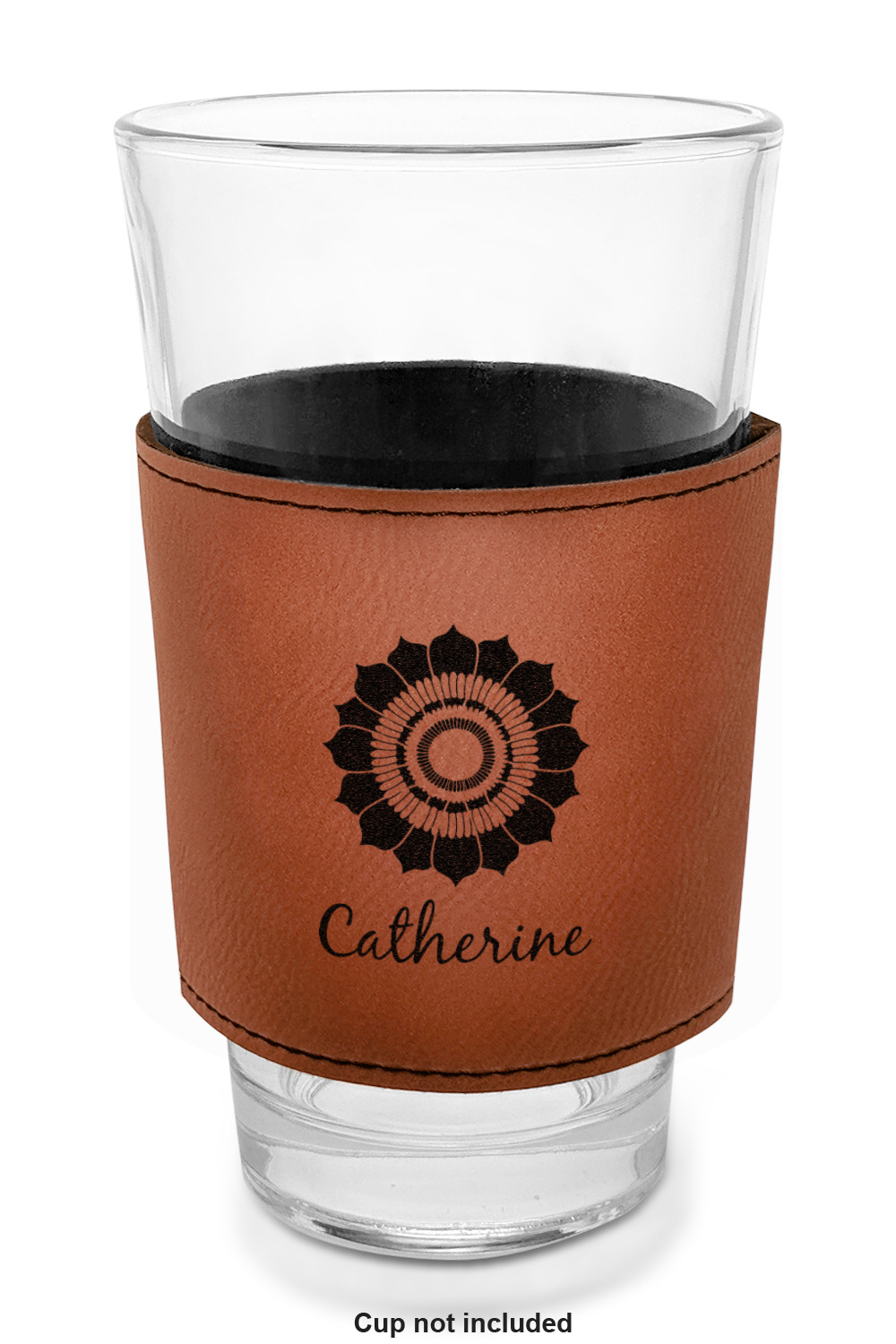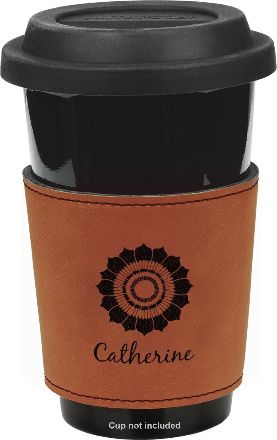 This cup sleeve is made from a suave, cognac-brown leatherette and finished with an intricate, black stitch. The interior of this can sleeve is fabricated from a thin foam material to help insulate your mug's contents. The sleeve is specifically made to suit tapered glasses or mugs, so the top's diameter is 3.5 inches, while the bottom's diameter is 2.75 inches. Your customized design will be laser engraved into the leatherette, leaving behind crisp, black imprint. With these products, we provide you with the option of engraving the front and back, or the front only.