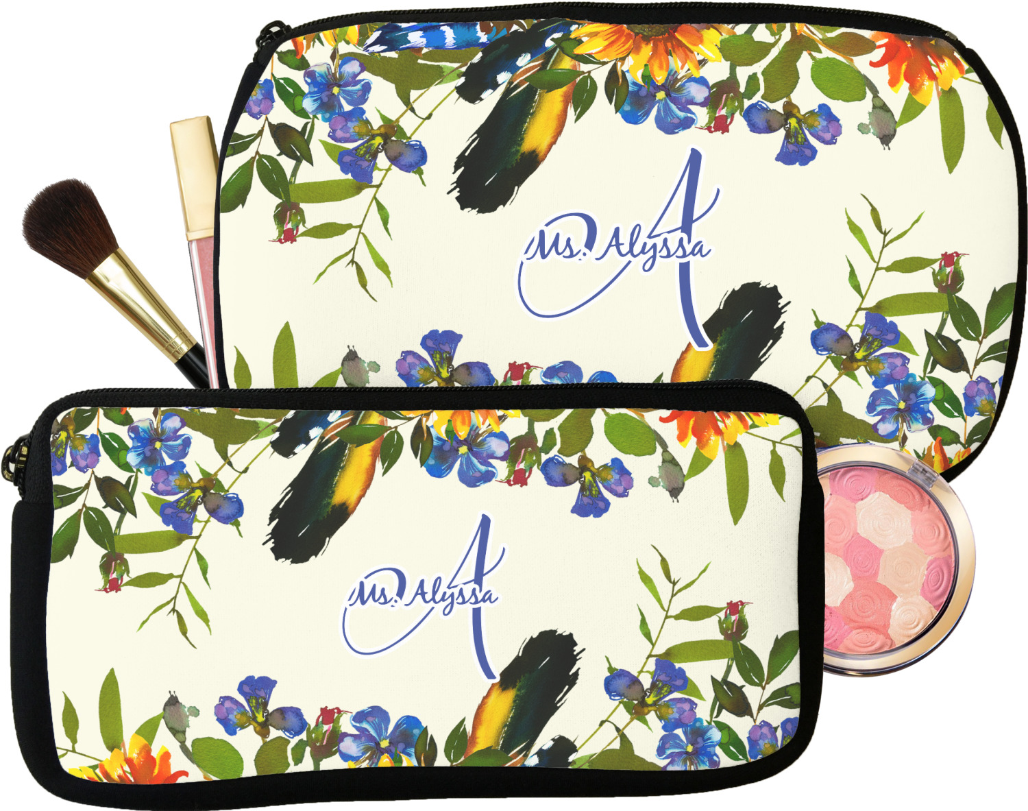 Our personalized makeup bags are available in many different designs, patterns and colors - so you are sure to find one that will love. They are made of neoprene (same material as wet-suits) and thus are water resistant, so spillages in your makeup bag will not end up all over you purse. They are customized on one side and are black on the other side and the zipper is black as well.