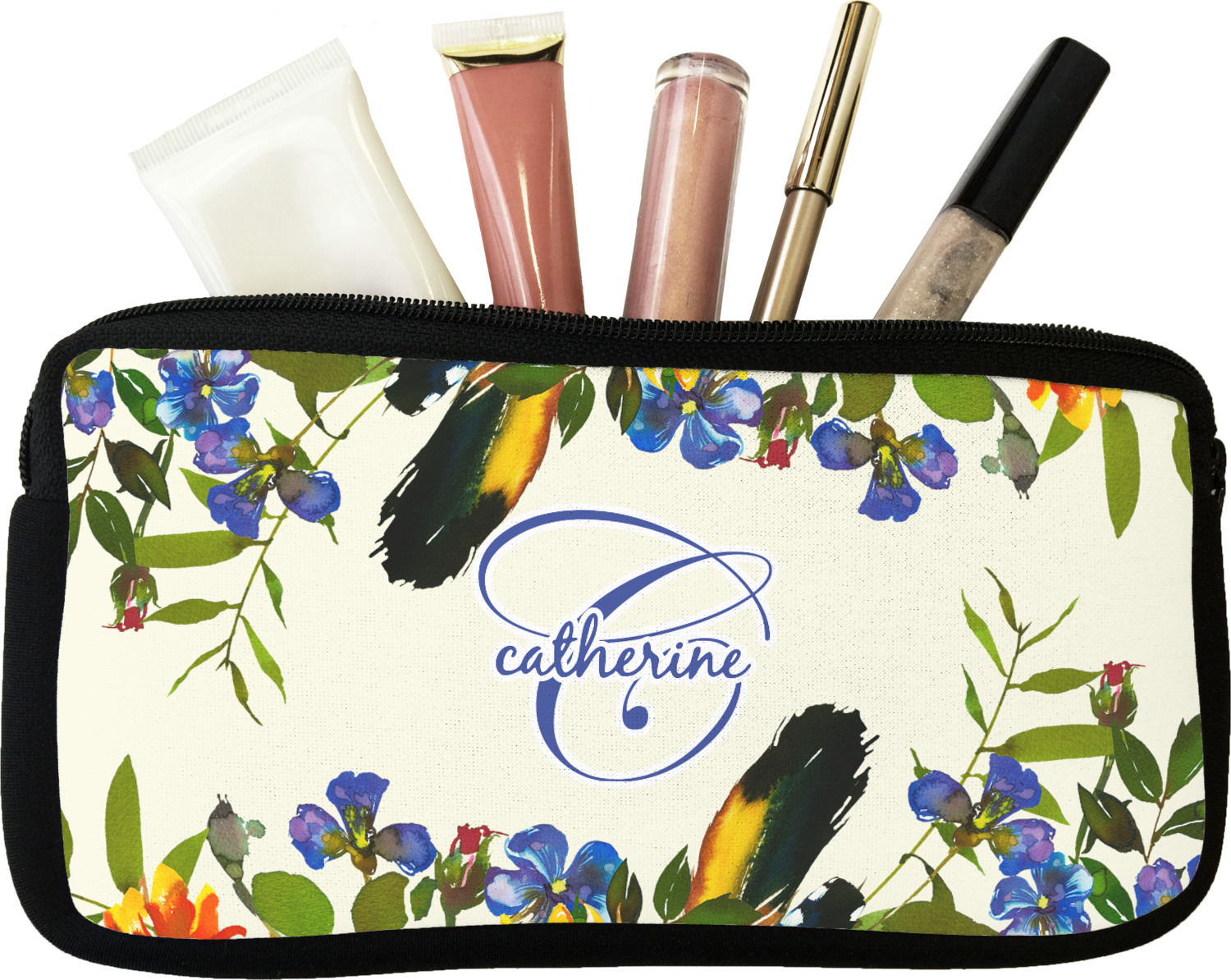 Our personalized makeup bags are available in many different designs, patterns and colors - so you are sure to find one that will love. They are made of neoprene (same material as wet-suits) and thus are water resistant, so spillages in your makeup bag will not end up all over you purse. They are customized on one side and are black on the other side and the zipper is black as well.