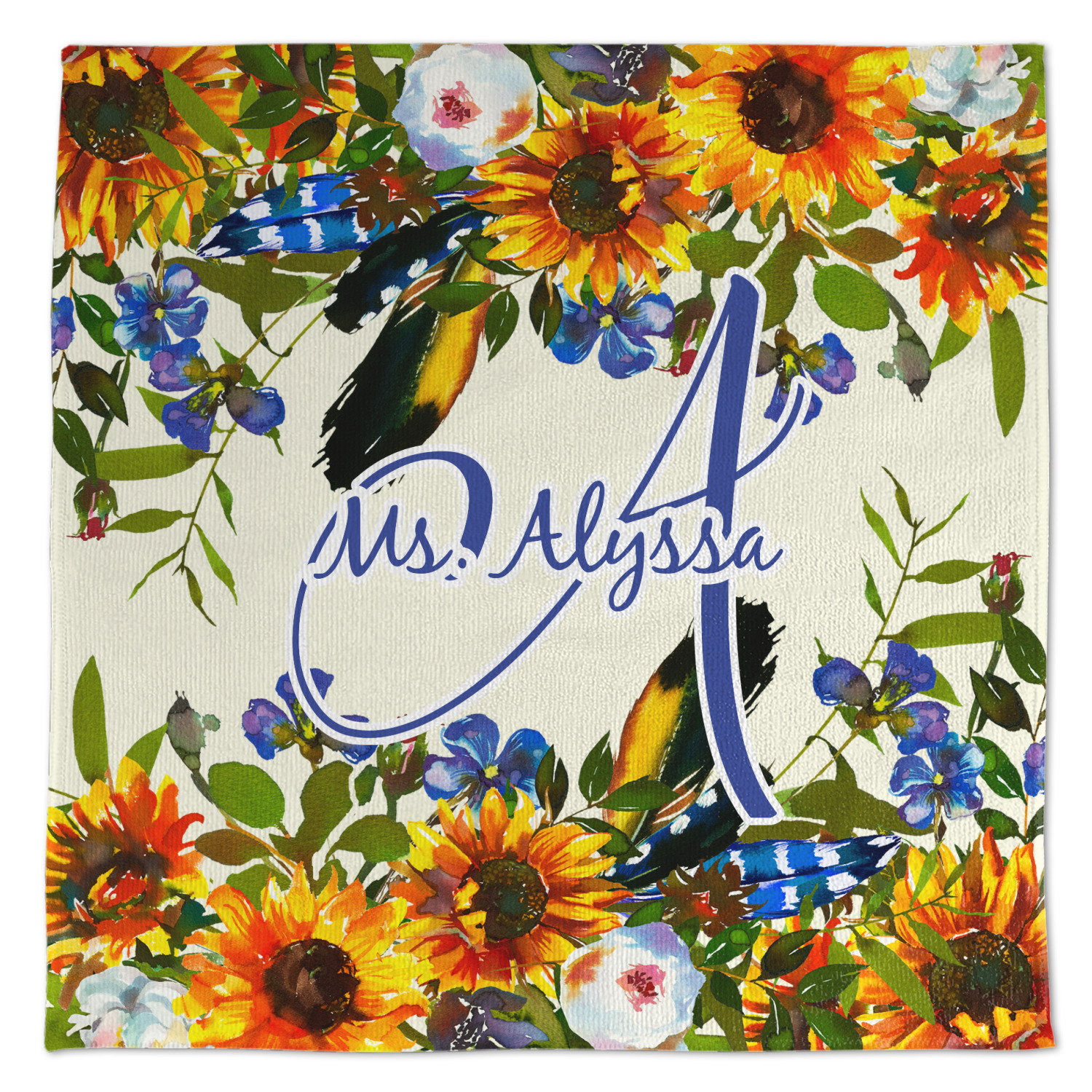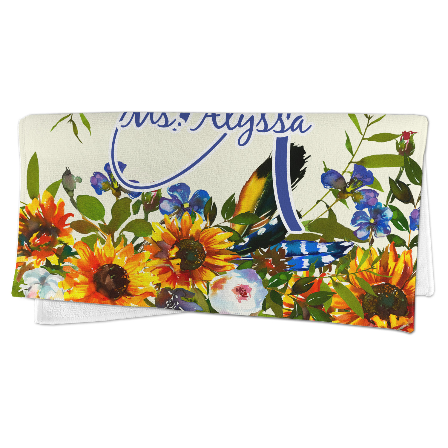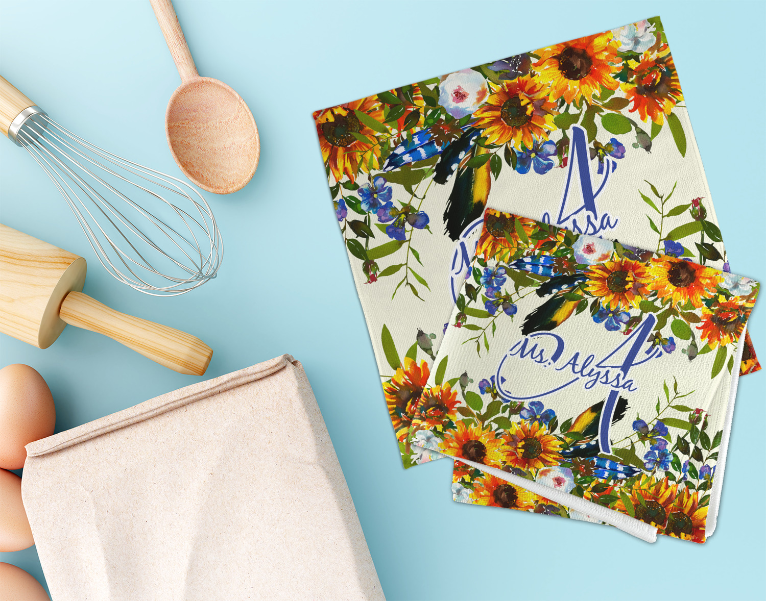 This sunflowers design template is simply beautiful. We chose to personalize it with a name & initial for the main design. We used the blue from the flower in the design and a really pale yellow background.