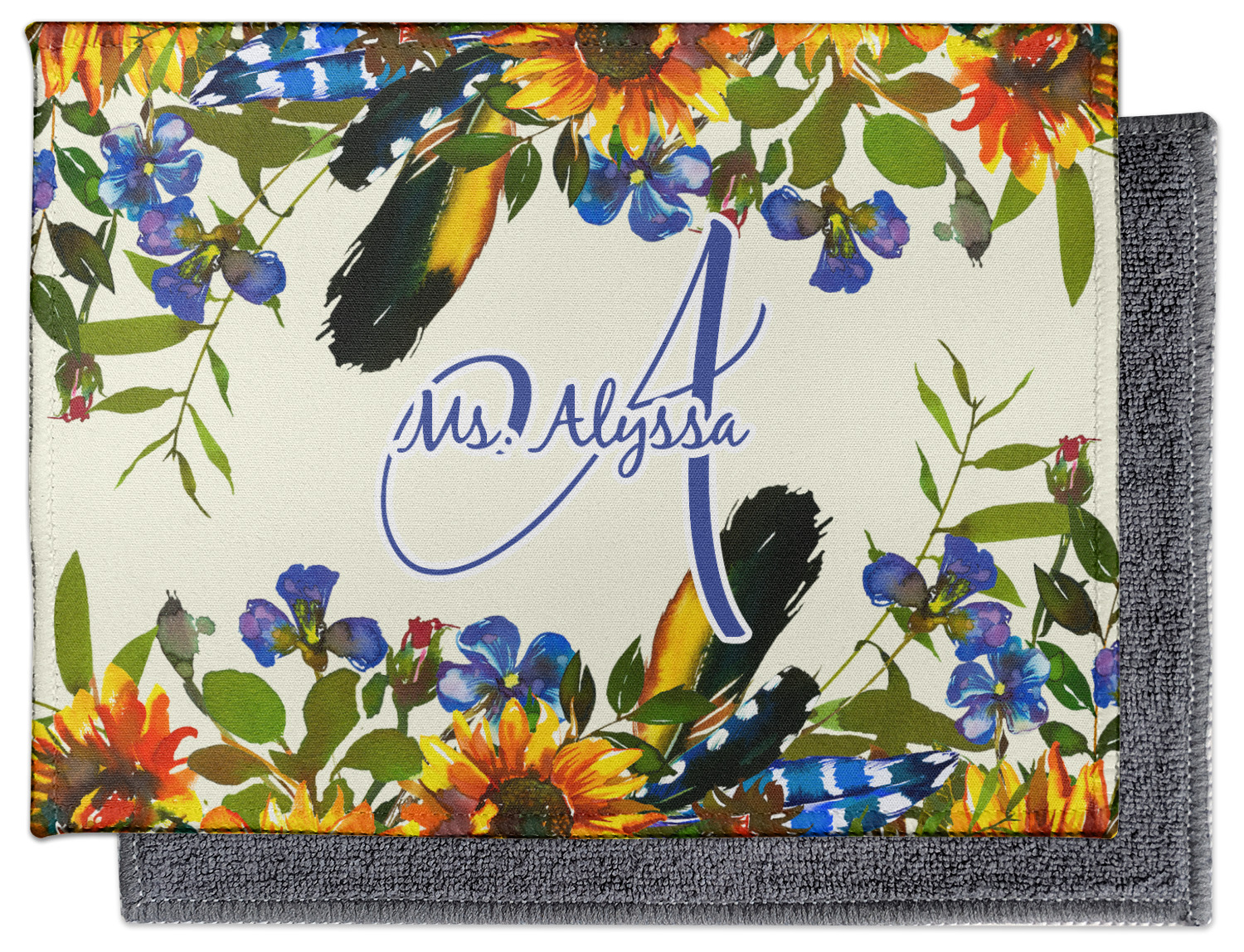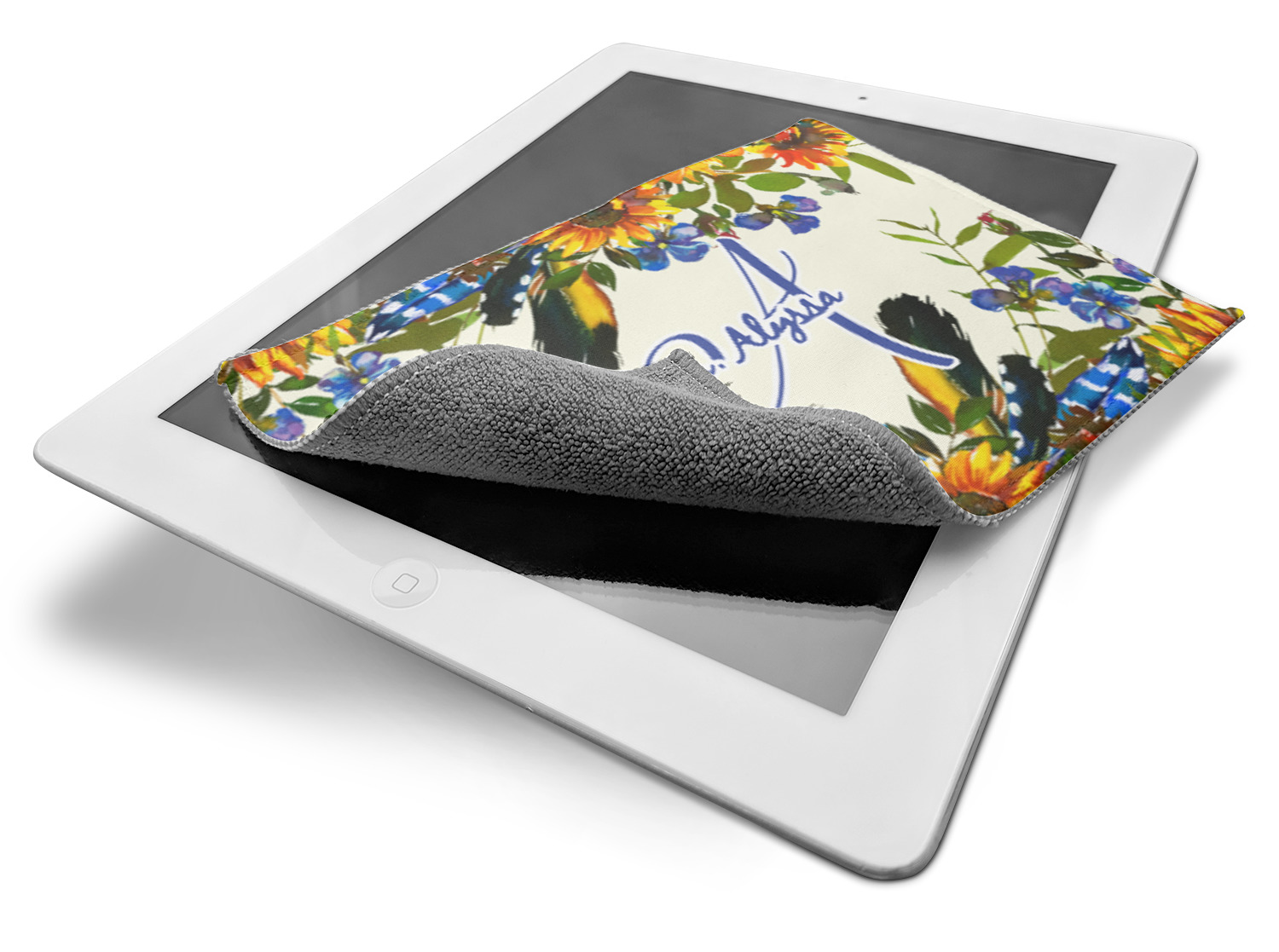 The back of this cleaning cloth is made from a gentle, grey microfiber material, that is masterful at removing smudges, grease, and fingerprints from lenses or electronic screens. The front side of the screen cleaner displays your personalized design in vibrant color. A beautiful stitch lines the edges and secures the microfiber to the polyester top. We provide you with the option of customizing this screen horizontally or vertically, depending on your preferences.
