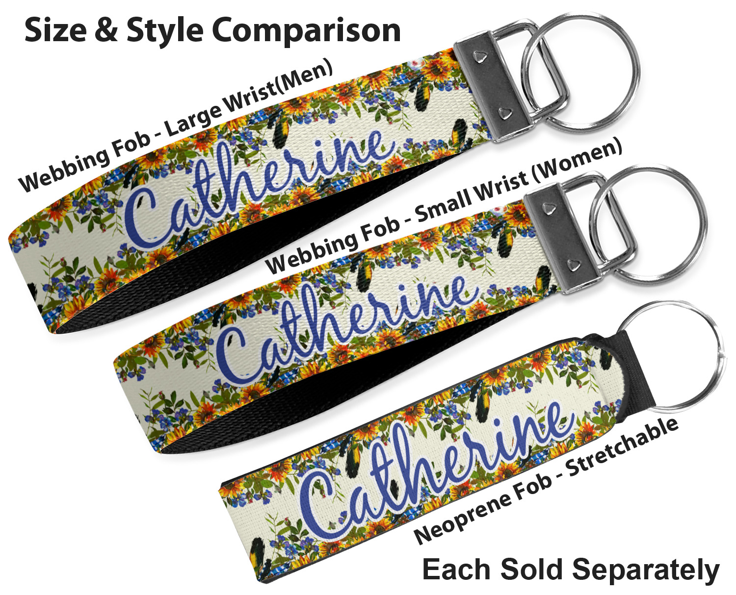 Made from neoprene, these key fob wristlets are comfortable, cushioned, easy to slip on and off; these traits allow it to maintain a slim, yet fashionable appearance, all while optimizing your efficiency. When attaching or removing keys, simply squeeze open the included metal ring. These fobs measure at around 4 inches, and have a bit of a stretch. Thus, they are best suited for small to medium size wrists. If you require a larger size, check out our webbing keychain fob for larger sizing.