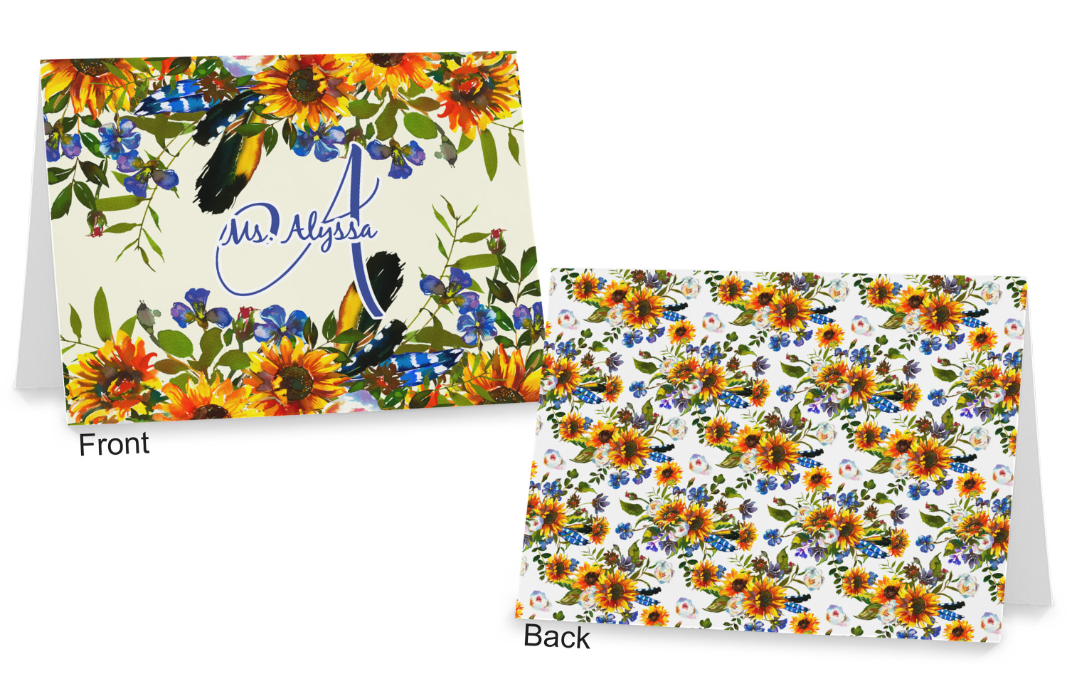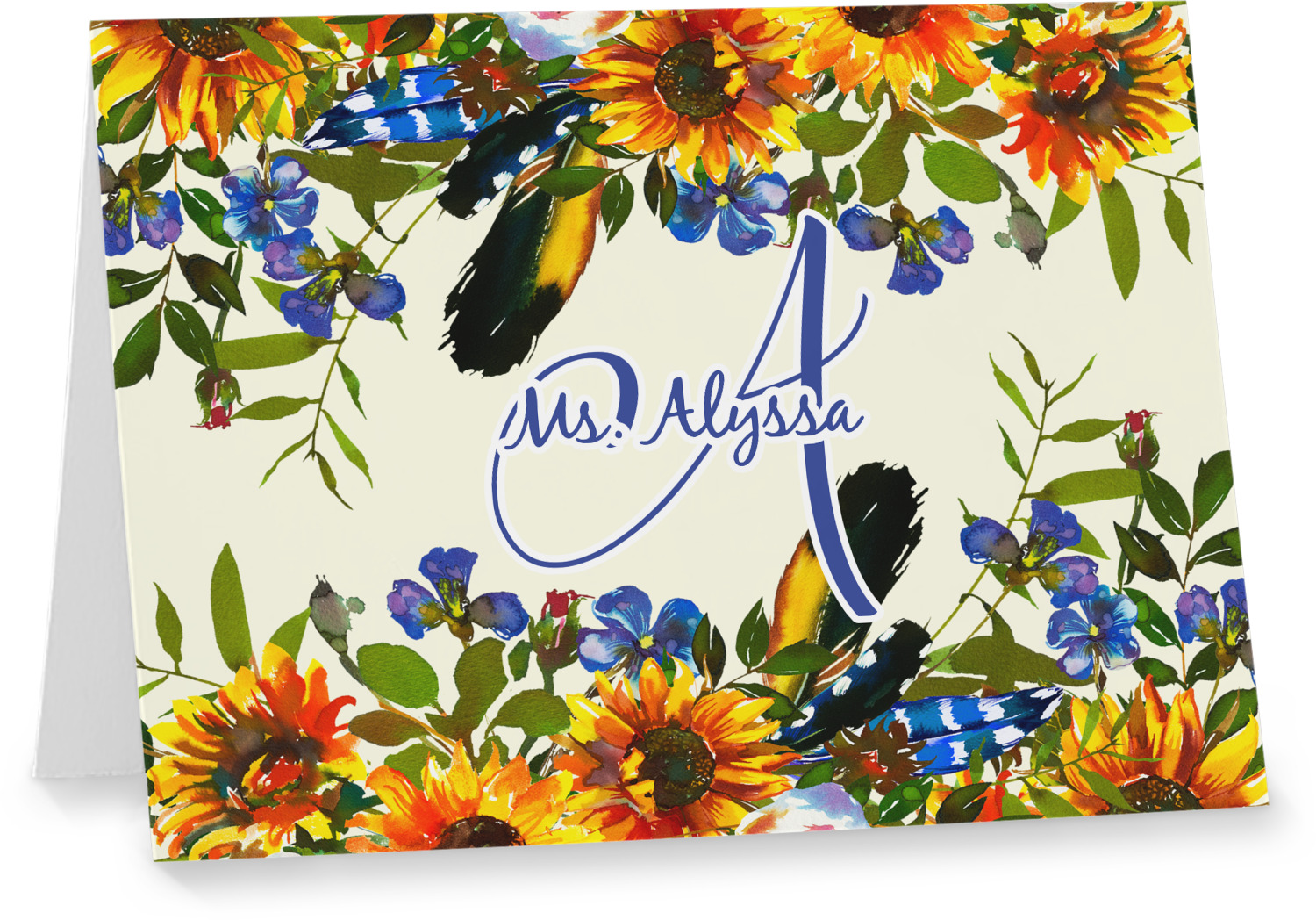 Our custom folded note cards are printed on premium 100lb. card stock and comes with white envelopes. The note card measure 5.5 by 4.25 inches and are blank on the inside for your handwritten message.