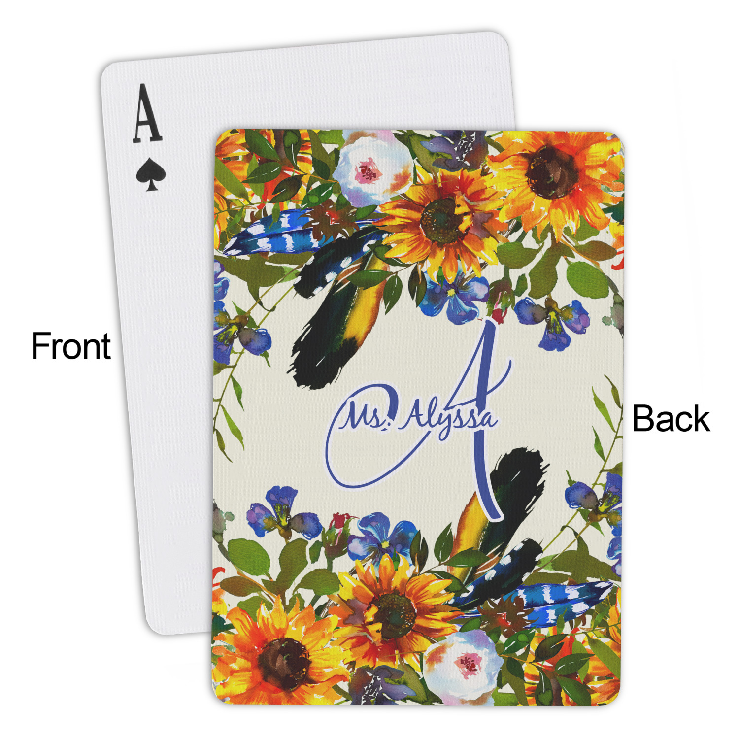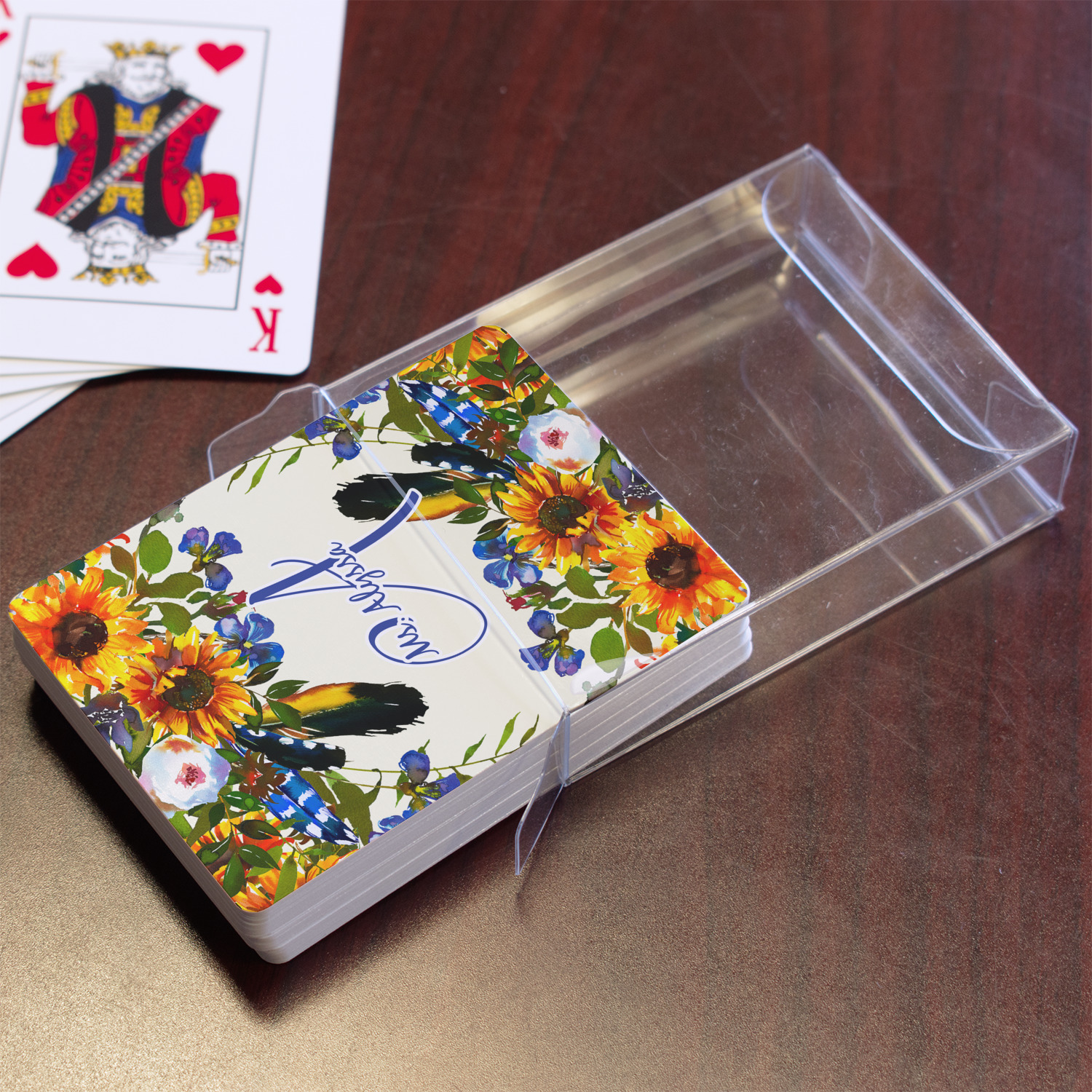 The customization / personalization is printed on the back side. The playing cards have a low gloss coating on both sides. The cards are packaged in a clear plastic box.