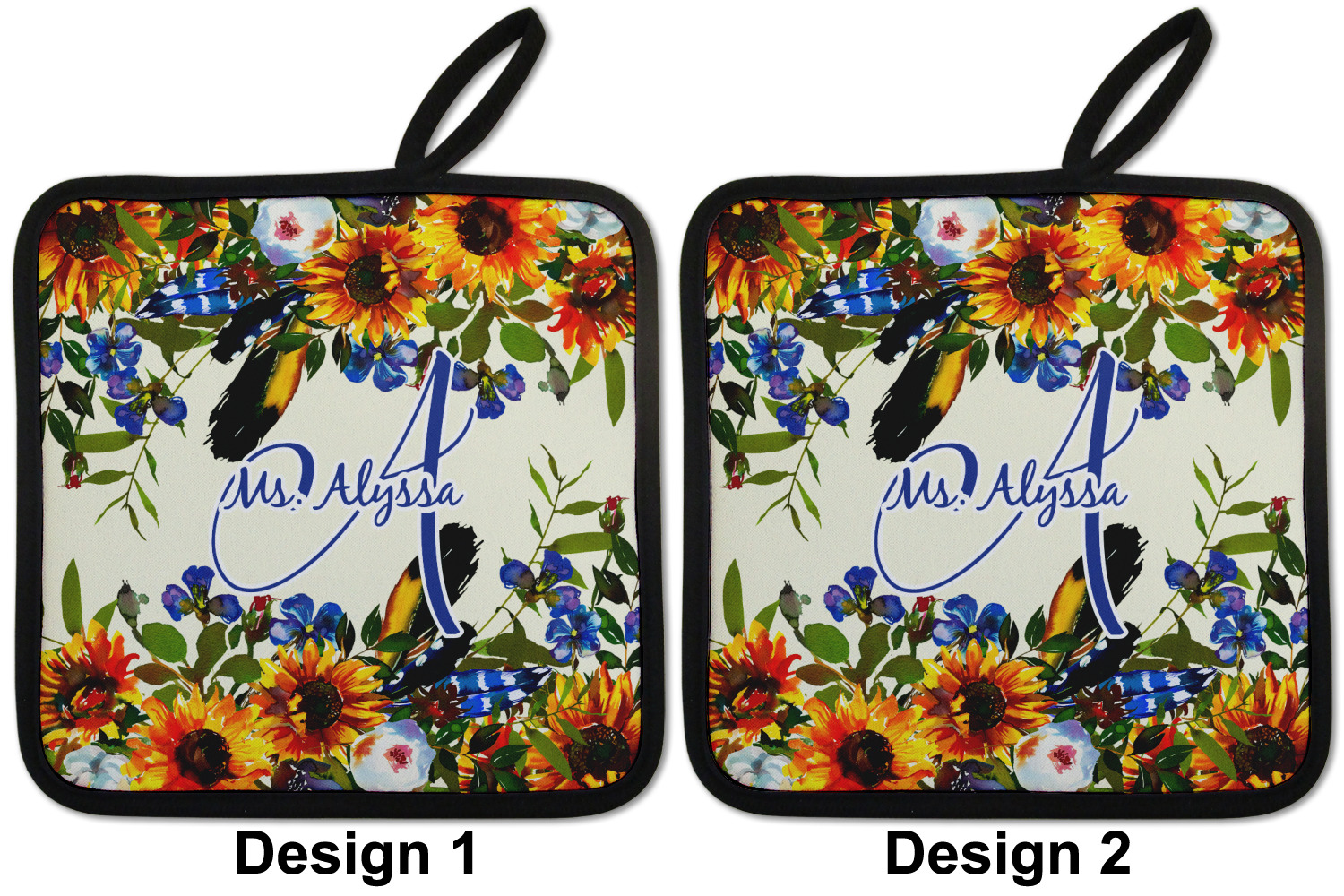 Our personalized pot holders feature a neoprene front that displays your personalization in vibrant colors. The backing of the hot pot holder is rubberized; the textured backing allows you to have a great grip when using this custom pot holder. The two materials are joined with a sleek, black trim, and the holder also includes an attached loop for hanging and storage. The pot holder is approximately 8.75 inches by 8.75 inches and 0.25 inches tall, while the fabric loop is 2.5 inches long. You can purchase a kitchen pot holder by itself or as a set of 2. We also offer a set including one pot holder and one oven mitt.