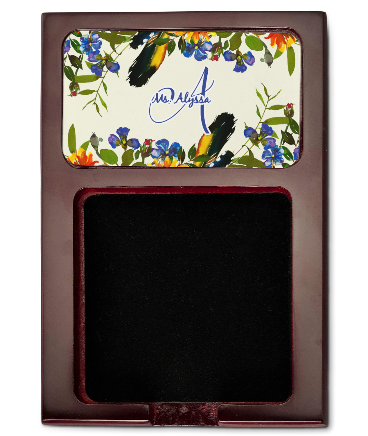 Crafted from a fine mahogany, this post it note holder is in the shade of a dark, cherry color. The dispenser itself is about 4.25 by 6.25 by 0.75 inches. You can place your 3 by 3 inch sticky notes in the indentation below the nameplate. We print your customization onto the nameplate that rests above the velvety indentation.