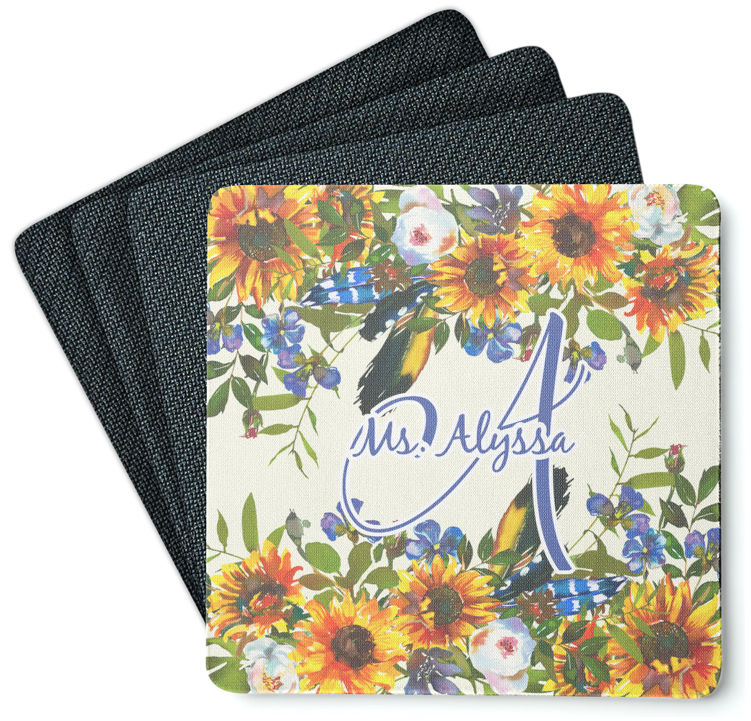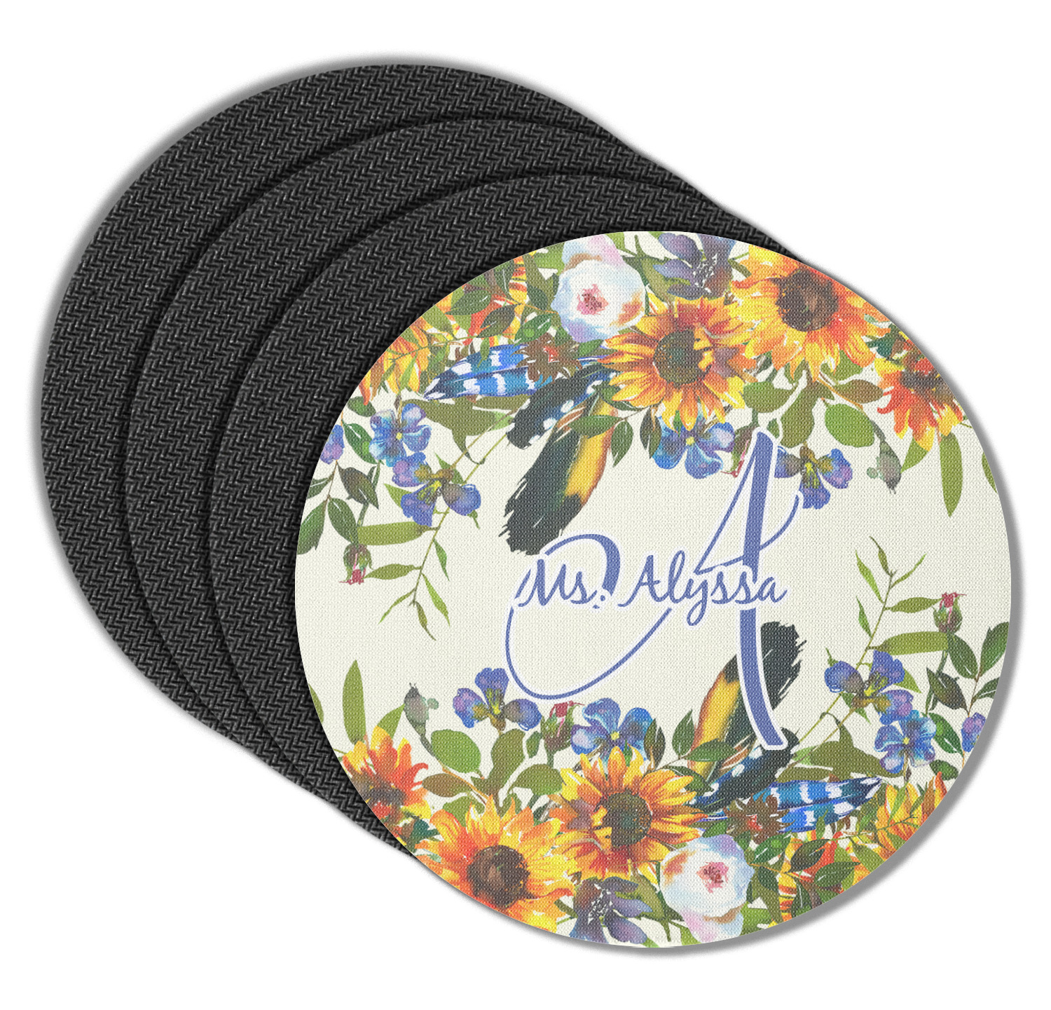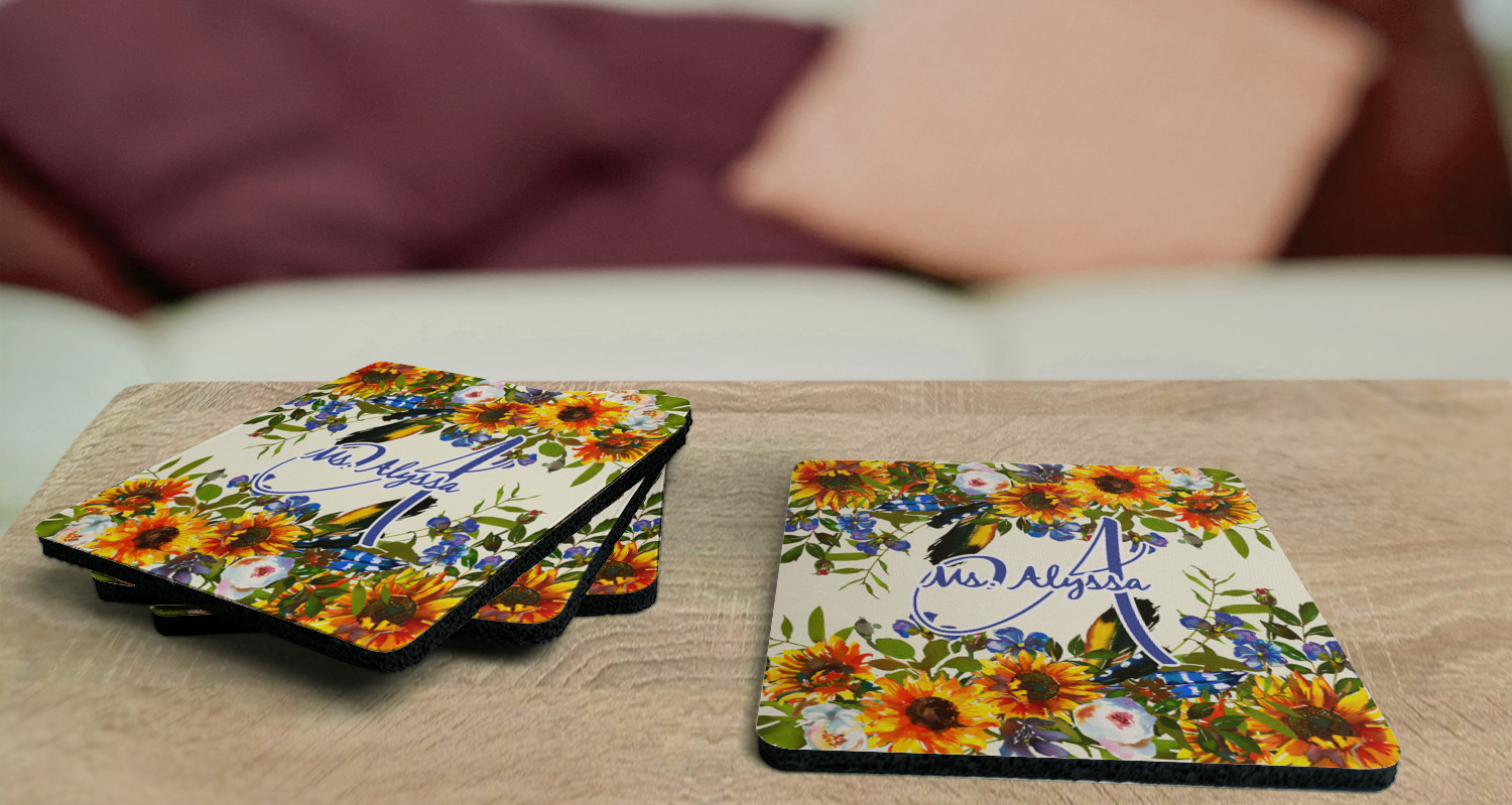 These drink coasters have a smooth, polyester top and a textured, rubber backing on its bottom. The non-slip rubber backing underneath works to keep any spills at bay. At 4 by 4 by 0.25 inches thick, these custom coasters are a suitable size for most drinkware. Your personalization is displayed atop the face of the cup coaster. We sell these rubber coasters in two different shapes: square and round. You can buy each shape as singulars or as a set of 4.