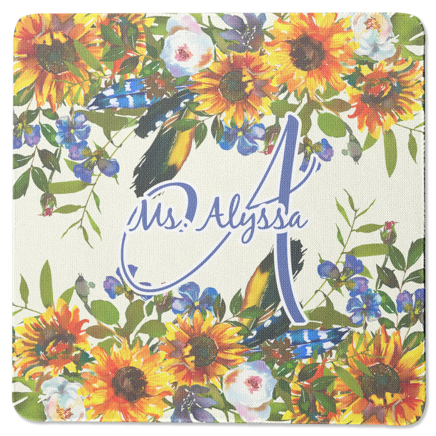 This sunflowers design template is simply beautiful. We chose to personalize it with a name & initial for the main design. We used the blue from the flower in the design and a really pale yellow background.