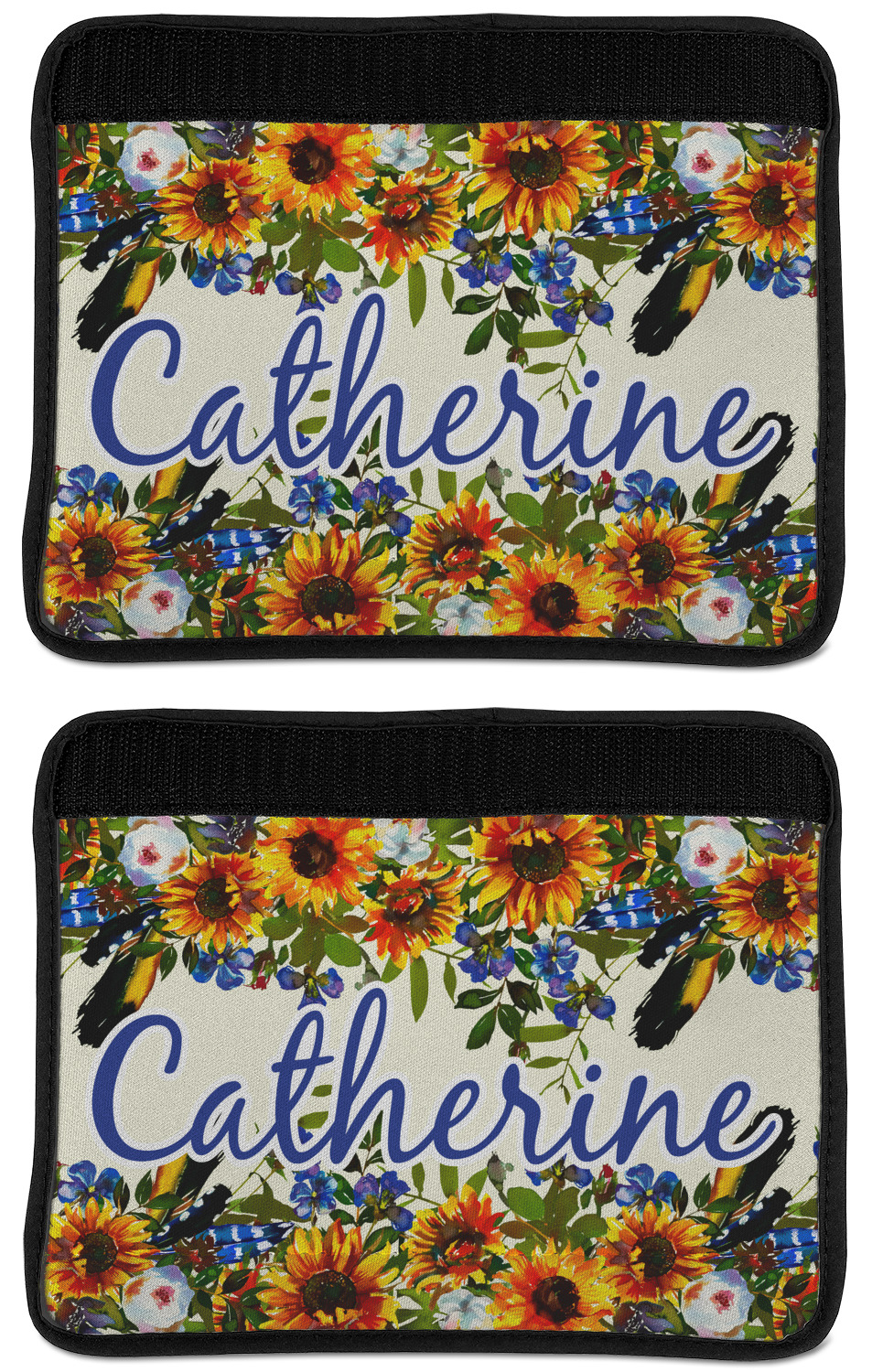 Made from neoprene, our seat belt strap covers wrap around the belt itself and have a Velcro tab for easy attachment and closure. The belt's edges are trimmed with a black polyester for a secure finish. Each cover is 9.5 by 7 inches when open and 9.5 by 2.5 inches when closed. We print your personalized design on the face of the seat belt pad.