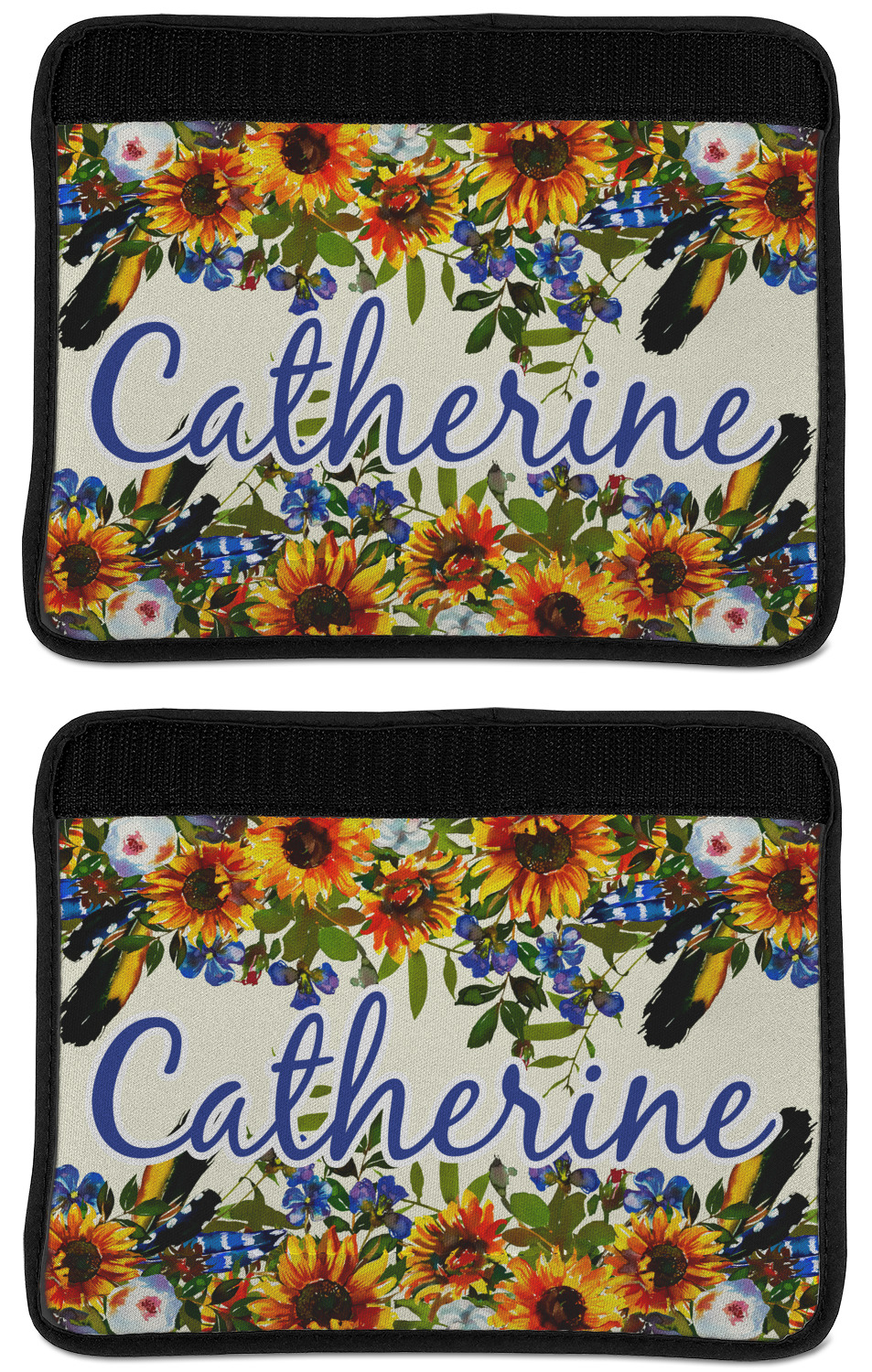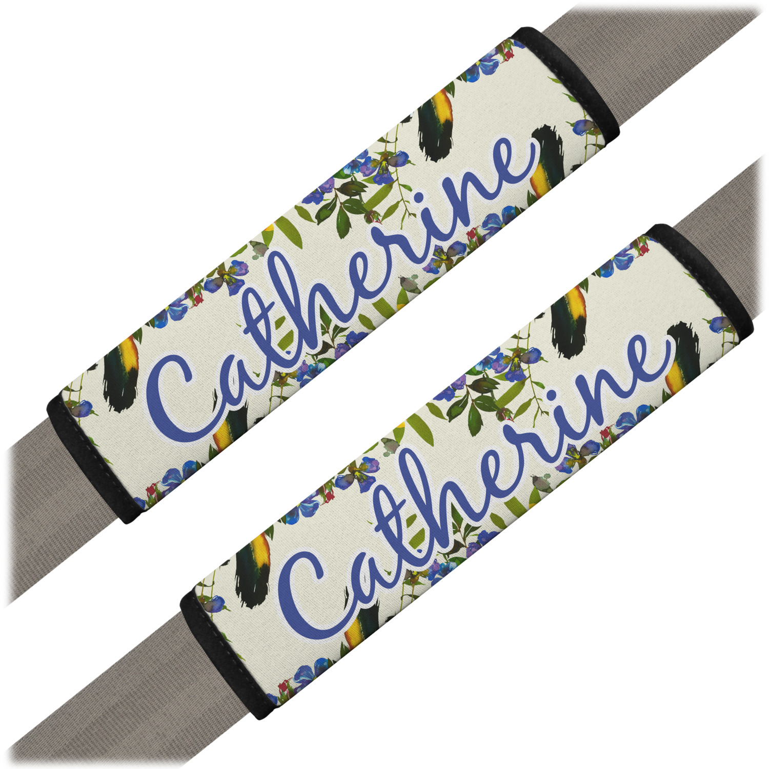 Made from neoprene, our seat belt strap covers wrap around the belt itself and have a Velcro tab for easy attachment and closure. The belt's edges are trimmed with a black polyester for a secure finish. Each cover is 9.5 by 7 inches when open and 9.5 by 2.5 inches when closed. We print your personalized design on the face of the seat belt pad.