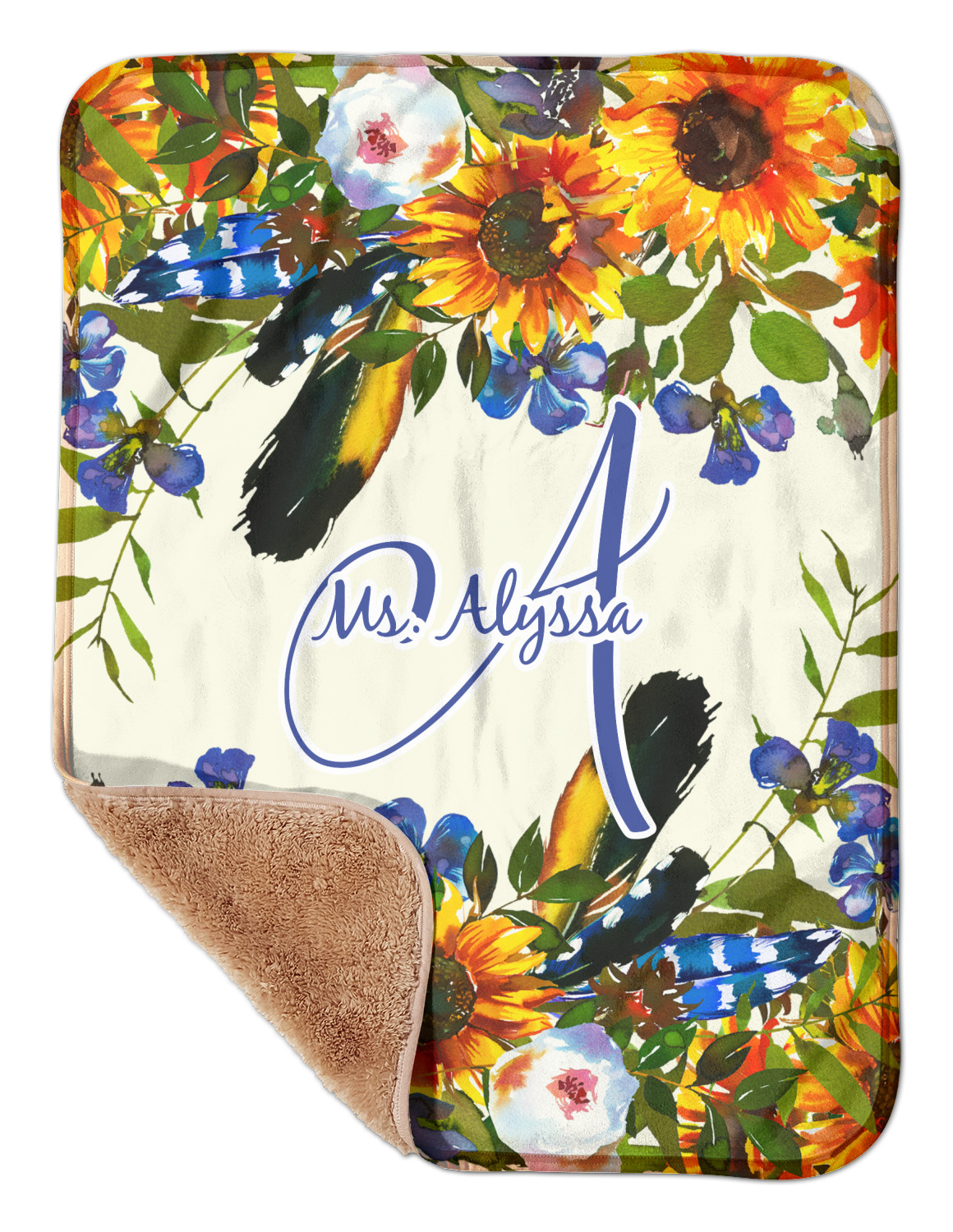 These toddler blankets are made of two different materials; the front side is made of a velvety, minky-like material that displays your customization and is perfect for a baby's delicate skin. The underside is crafted from a fluffy, sherpa fleece, and bears a classy, tan color. The dual texture gives your baby added comfort, as both sides are incredibly soft and plush. The corners of this blanket are rounded, and the ribbing of the blanket is a tan color, which complements the sandy color of the sherpa fleece. At approximately 30 by 40 inches, this custom baby blanket is the perfect size for babies and toddlers.