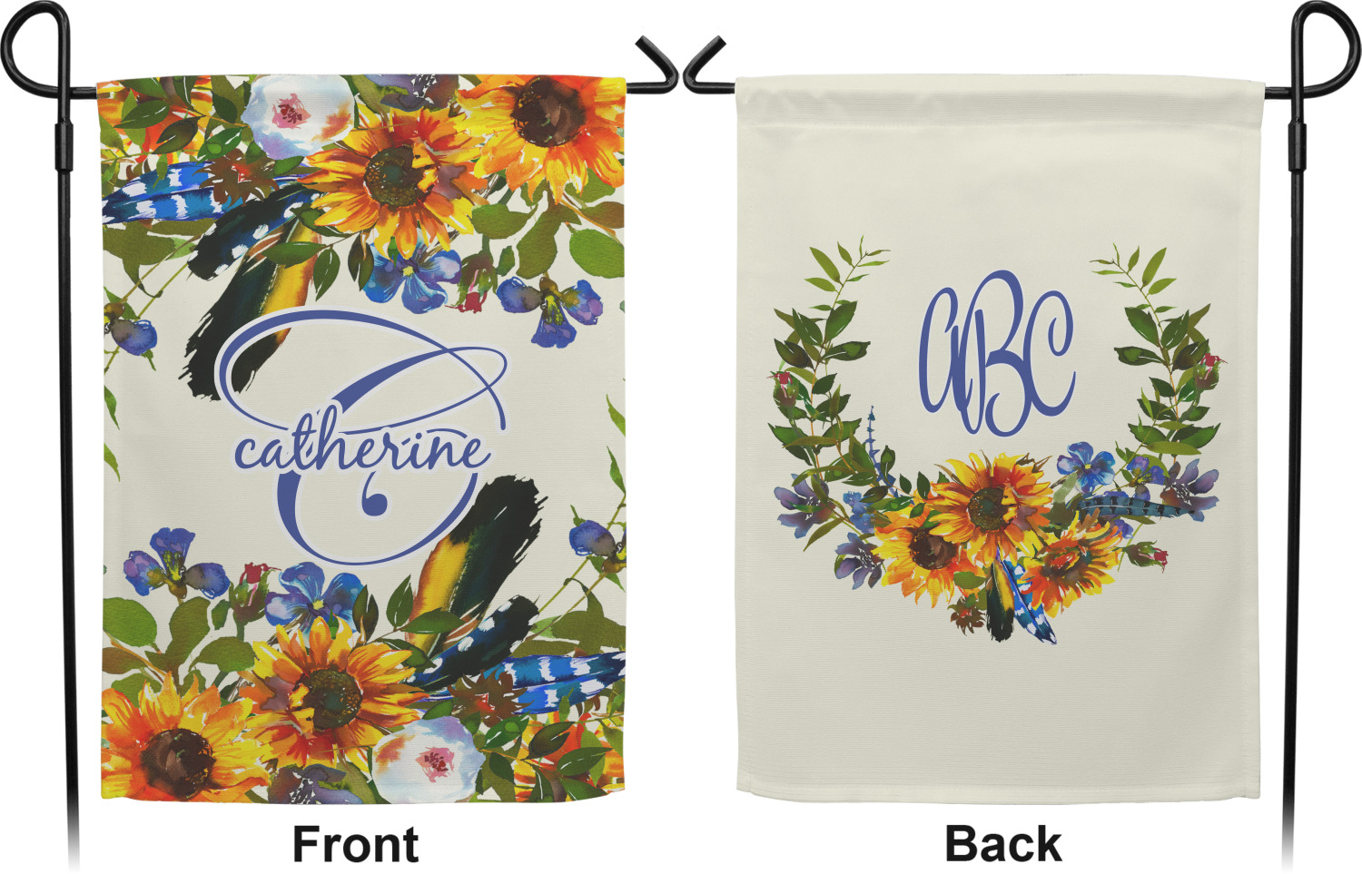These custom garden flags are made of a durable, double-ply, polyester weave, allowing them to withstand the elements year round. The small flags measure at approximately 12 by 18 inches. The large flags measure out to 28 by 37 inches. You can order these decorative flags with your customization printed on the front only, or the front and back.