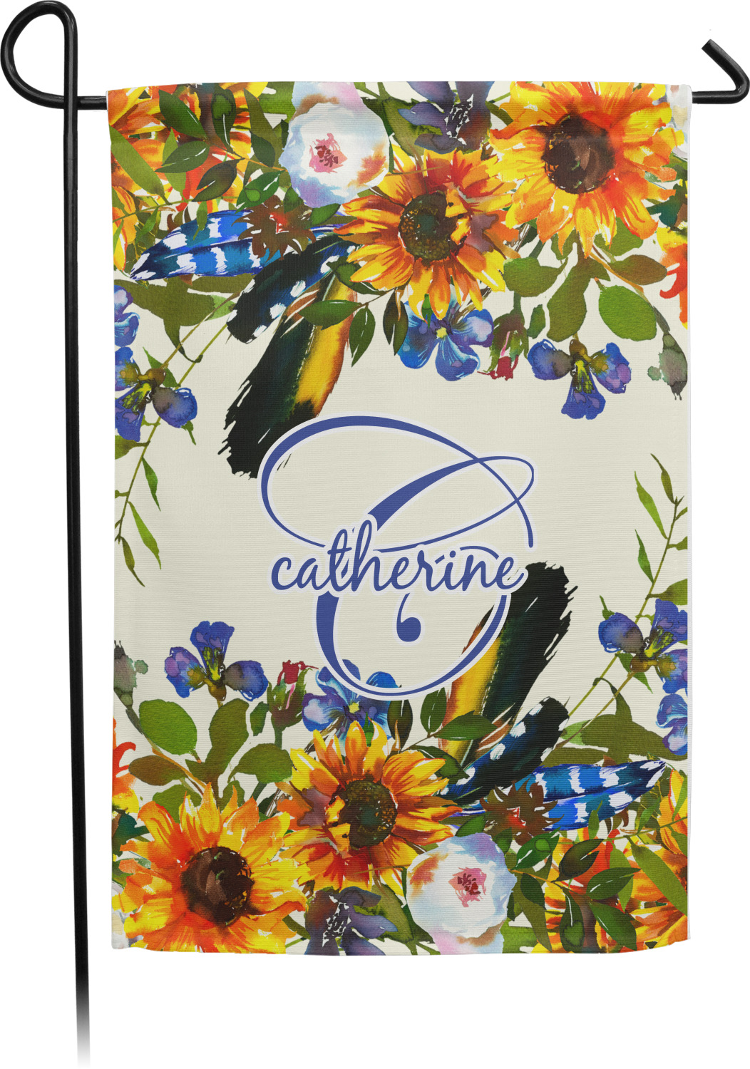 These custom garden flags are made of a durable, double-ply, polyester weave, allowing them to withstand the elements year round. The small flags measure at approximately 12 by 18 inches. The large flags measure out to 28 by 37 inches. You can order these decorative flags with your customization printed on the front only, or the front and back.