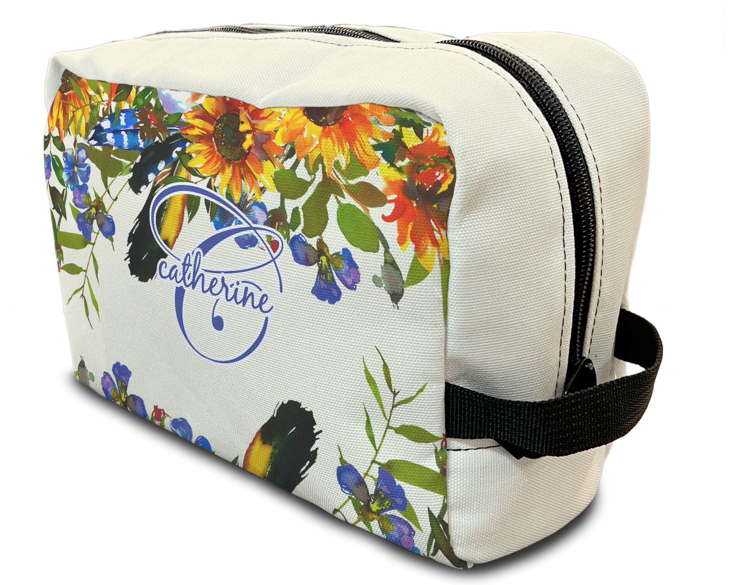 Our toiletry bag has the traditional dopp kit design i.e. a side to side zippered closure, giving you easy access to all the contents inside and a sturdy handle on one side of the bag. The canvas fabric for dopp kits is printed, then cut and sewn here in the USA.