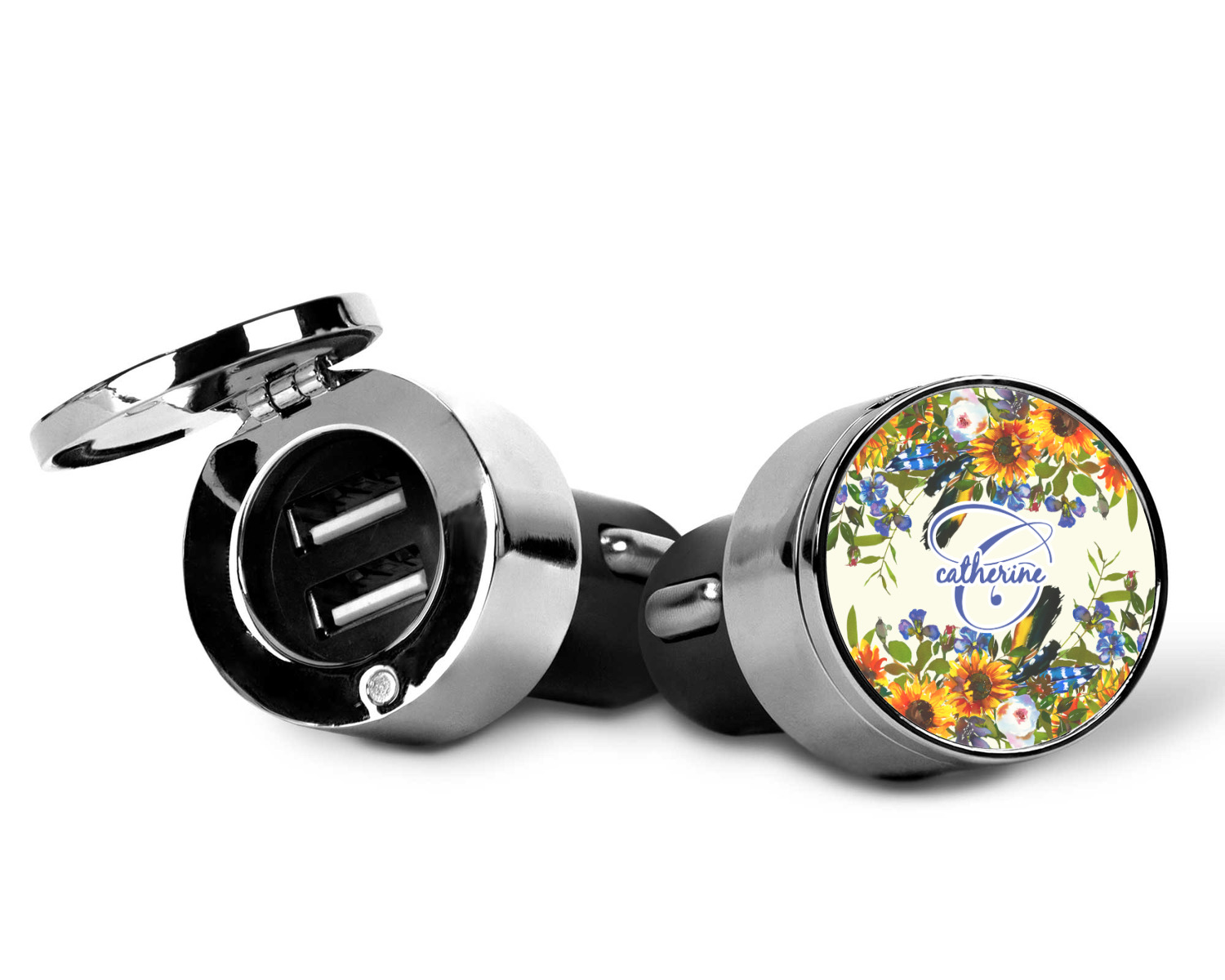 This car charger adapter converts your cars bland cigarette lighter into a decorative, personalized, and operational USB charging port. Made of solid, silver-plated metal, these chargers feature a flip-open lid that both displays your customized design and conceals two USB ports. The metal lid of the USB car charger adapter is 1.5" in diameter and seals due to a small, ingrained magnet on both the charger and its lid. The cigarette lighter insert, itself, is colored black.