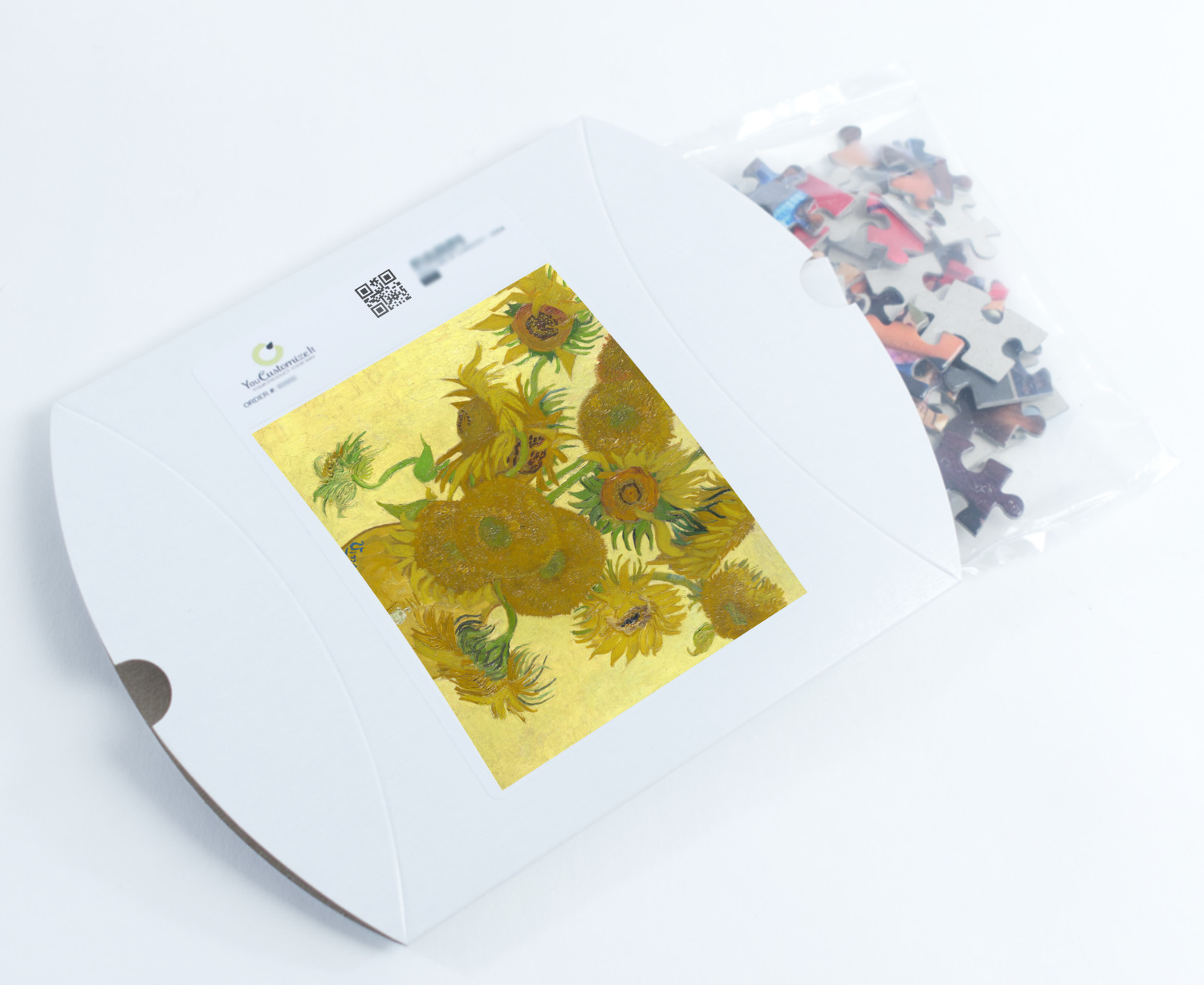 We print our puzzles on thick white chipboard in vibrant colors, then laminate the chipboard and die cut your puzzle. Your jigsaw puzzle is shipped to you in a box with the image of the puzzle on the box.