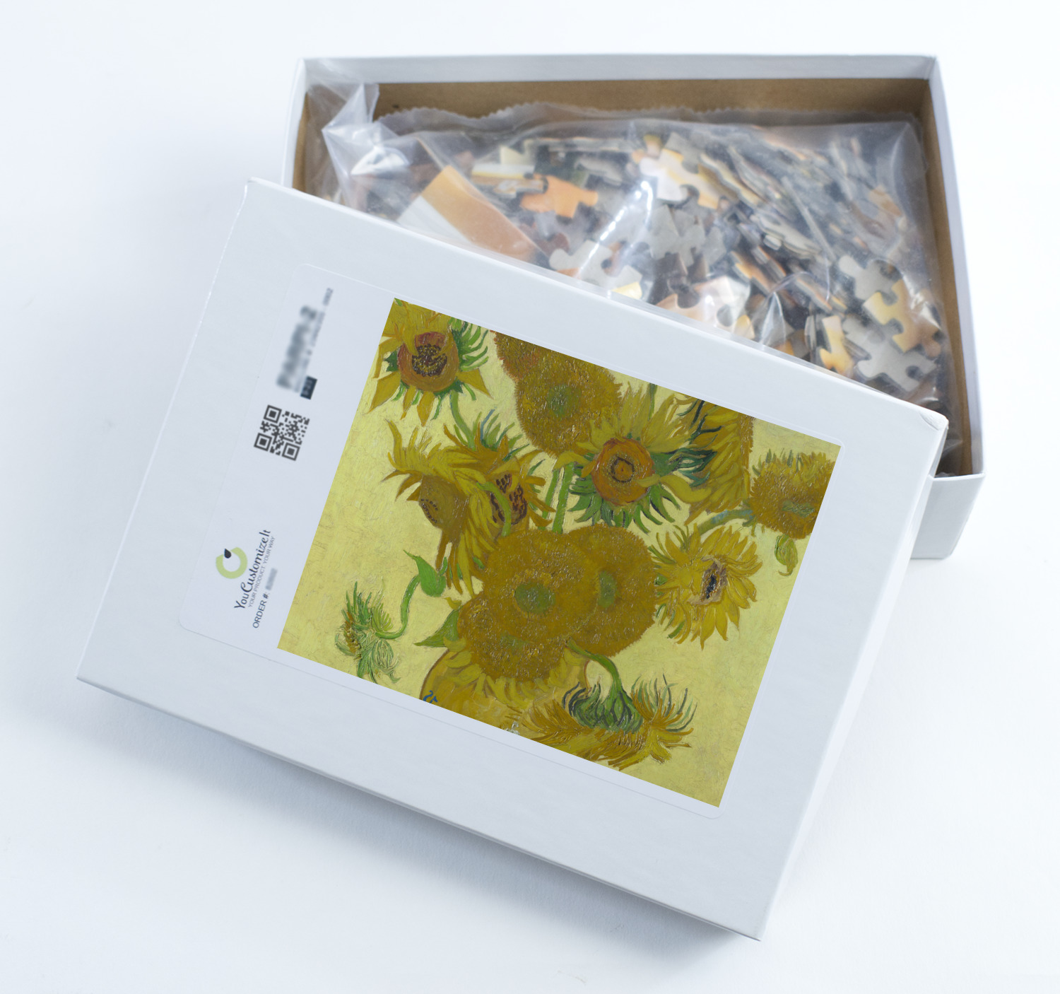 We print our puzzles on thick white chipboard in vibrant colors, then laminate the chipboard and die cut your puzzle. Your jigsaw puzzle is shipped to you in a box with the image of the puzzle on the box.