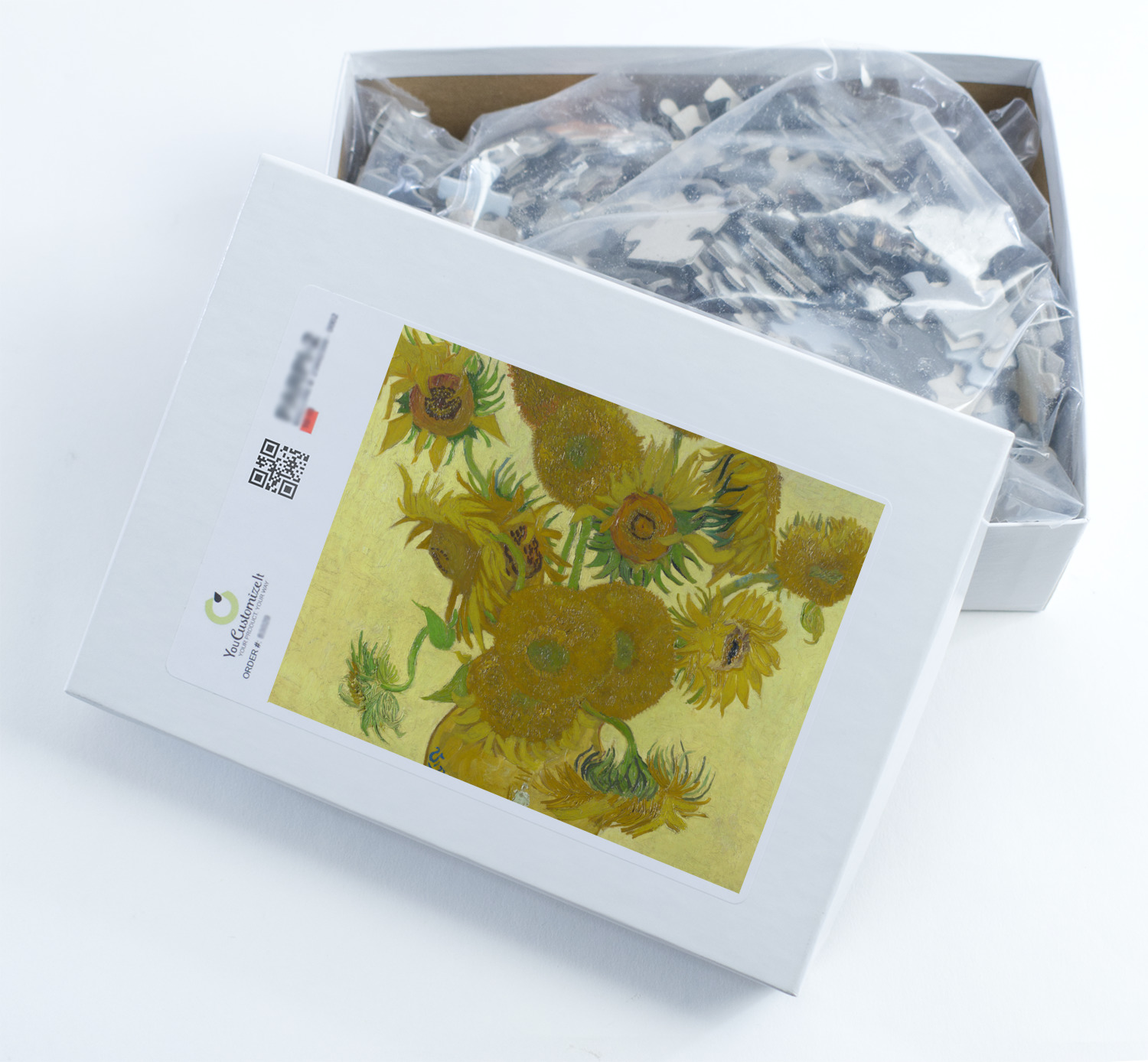 We print our puzzles on thick white chipboard in vibrant colors, then laminate the chipboard and die cut your puzzle. Your jigsaw puzzle is shipped to you in a box with the image of the puzzle on the box.