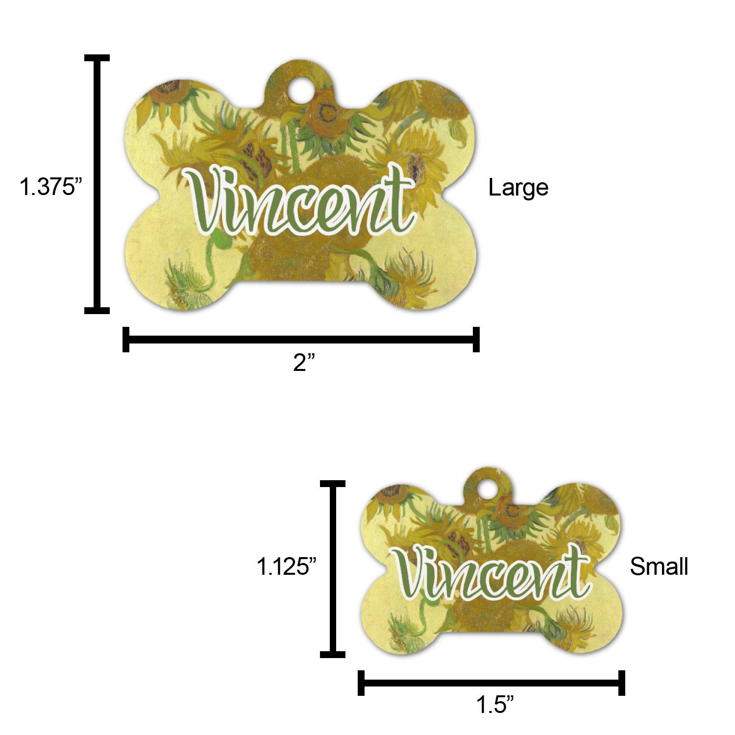 The small bone dog tag size is perfect to pair with our small dog collars, the large size pairs well with our large dog collars.