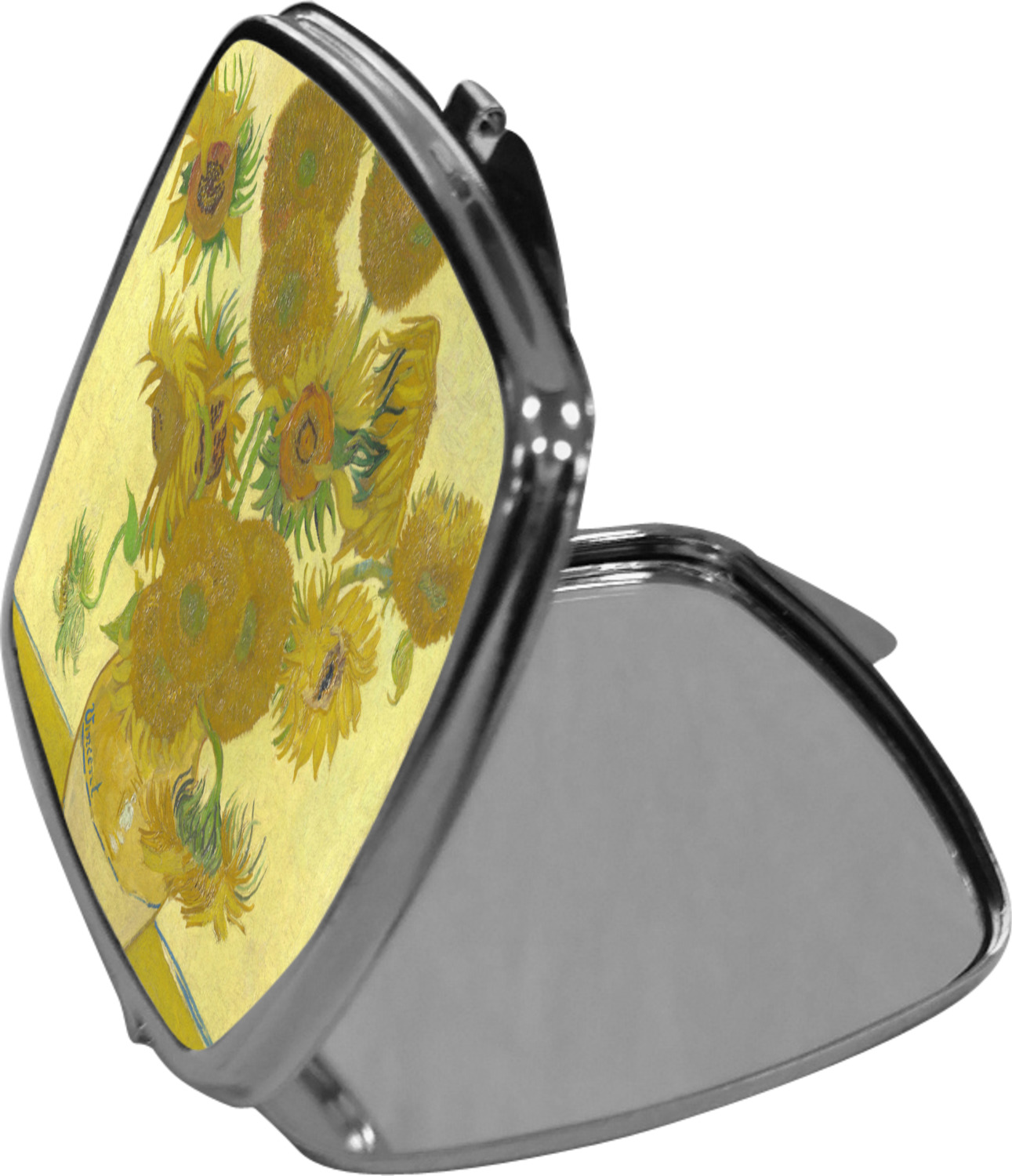 Our compact mirrors are customized with your design on one side. The other side is patterned silver tone metal. Inside, there are two mirrors.