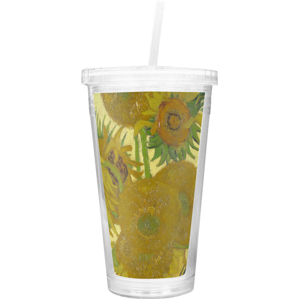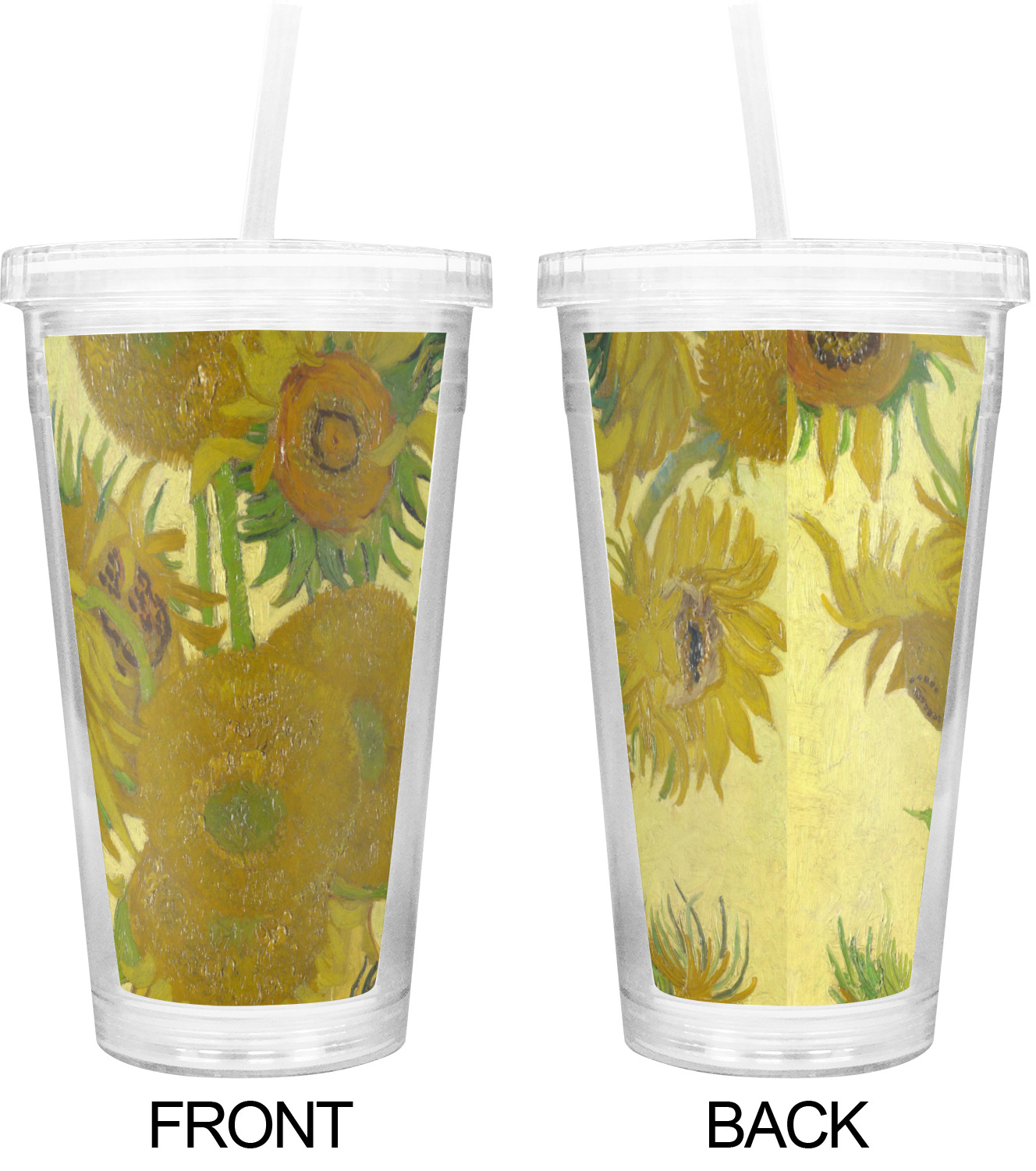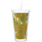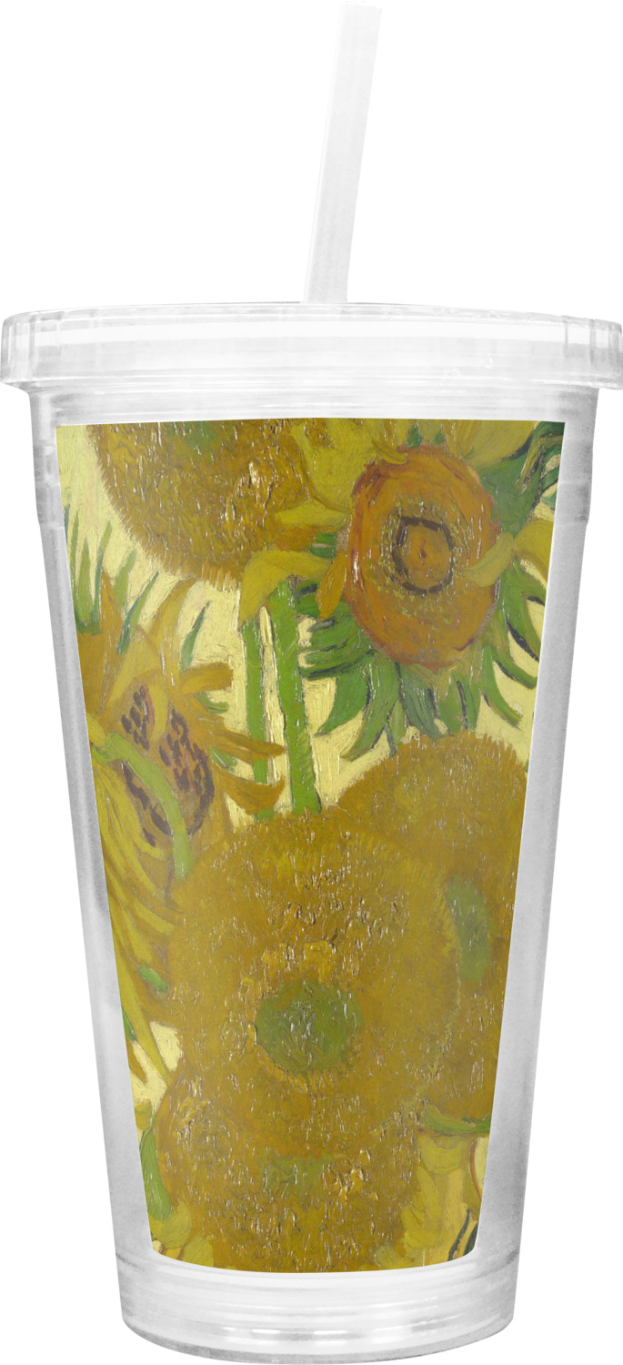 These BPA free tumblers with their double walls keep your drink cold and will not sweat on the outside; they have a clear acrylic top and a reusable straw with a ring around the bottom to keep the straw from falling out.