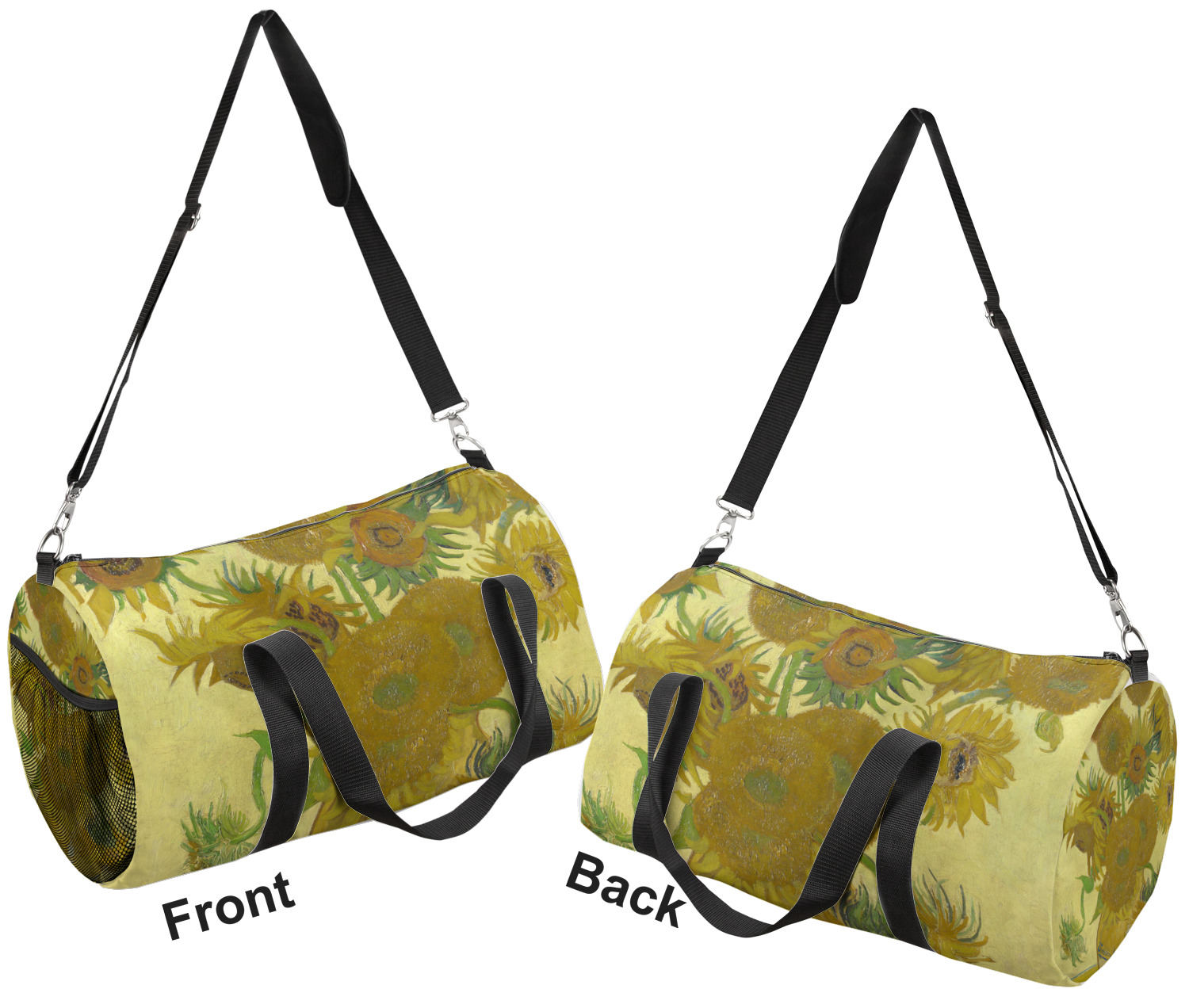 This duffle is a sturdy bag made of a canvas material. It comes in two sizes: Small (19"W x 9.5"H x 9.5"D) and Large (23"W x 12"H x 12"D). The bag is a cylindrical shape with a black adjustable strap and two handles. On one side is an elastic pouch to put a waterbottle or other small item. Your product will be sublimated with your design and is able to be designed on the front, back, and sides. Be sure to remember that the straps may cut into parts of your design if you upload your own artwork.
