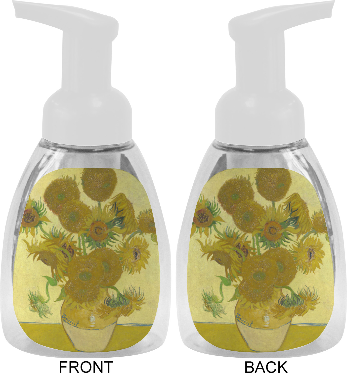 This soap dispenser is made of a robust plastic and has a clear base. The included soap pump is available in black or white color. This dispenser is 6.5 inches tall, 3 inches wide, and 2 inches deep. We display your customized designs on the front and back sides of these foaming hand soap dispensers.