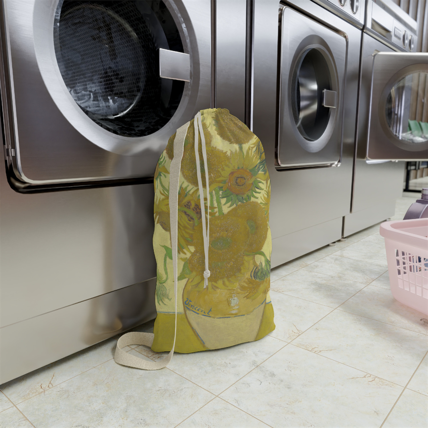 Carry your laundry in style with these customized laundry bags. Available in two sizes, featuring a natural colored woven strap and a cinch cord, these bags hold a lot of clothes or anything else you want to fit in them.