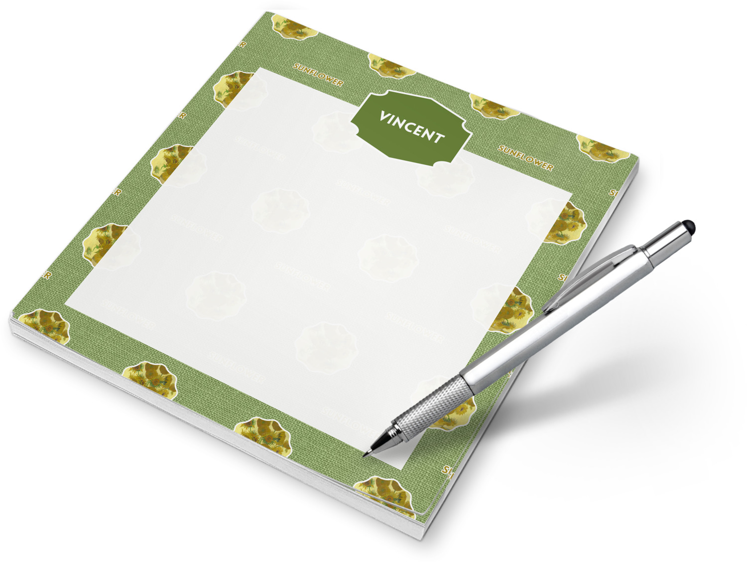 Your custom notepad features 50 sheets of thick, white paper, with your customization in the background and the edges. At approximately 6" x 5.5", these personalized memo pads are slightly larger than your average notepad. The individual notes tear easily from binding, which allows for quick, convenient, note-taking.