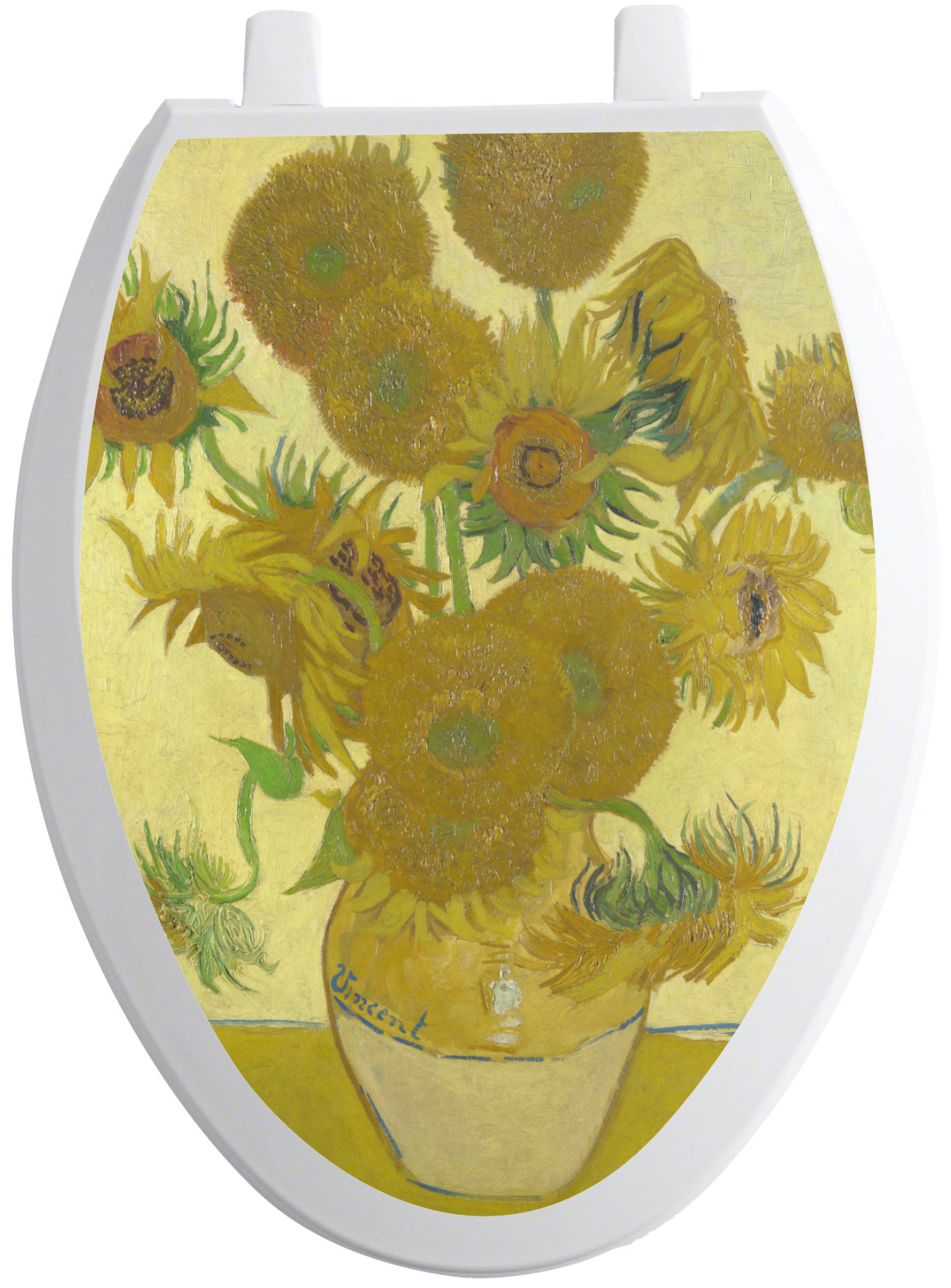 We sell these toilet lid decals in two different shapes to accommodate a wider range of toilet seat shapes. The first shape is our standard, round size, which measures at 13.5 by 12 inches. Our second option is an elongated shape, suited for long toilet seat covers. It measures 15 by 12 inches.