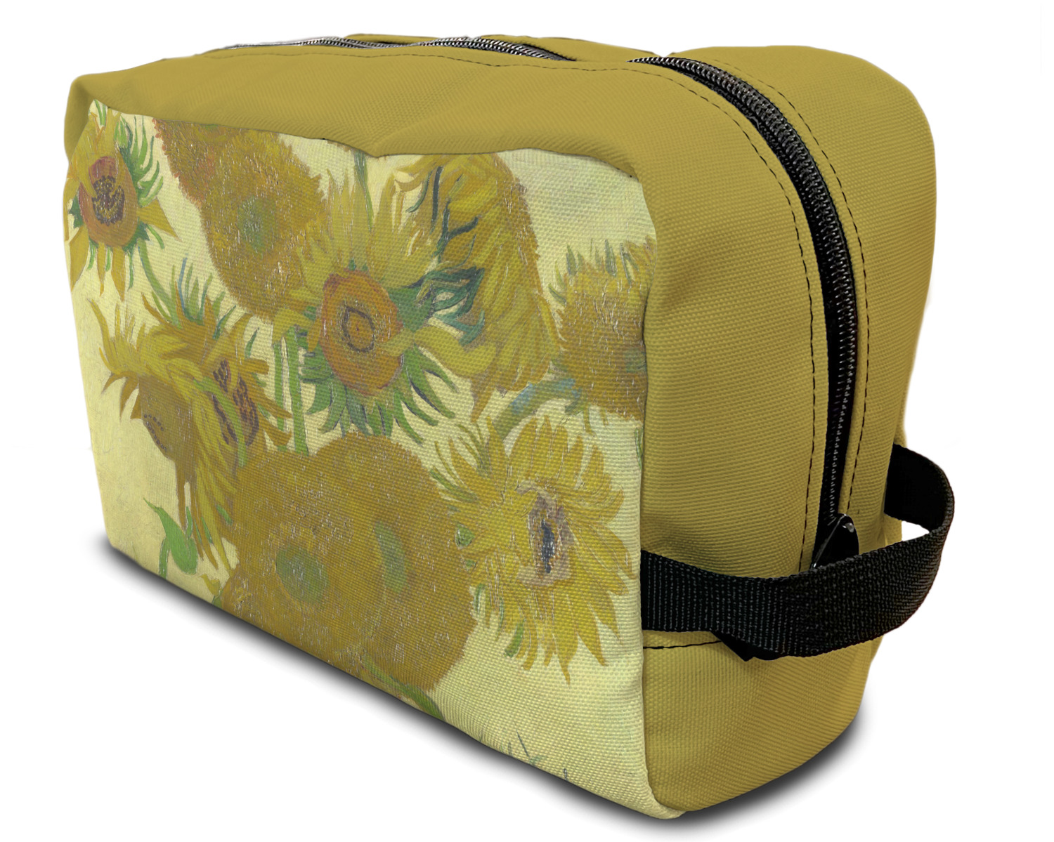 Our toiletry bag has the traditional dopp kit design i.e. a side to side zippered closure, giving you easy access to all the contents inside and a sturdy handle on one side of the bag. The canvas fabric for dopp kits is printed, then cut and sewn here in the USA.