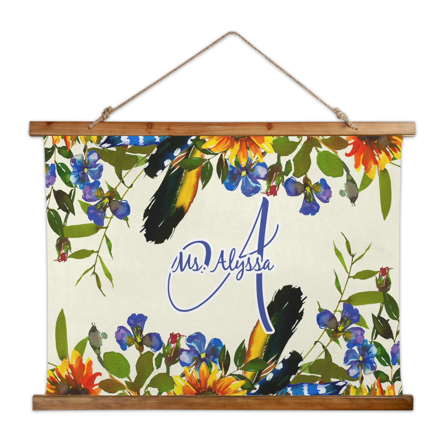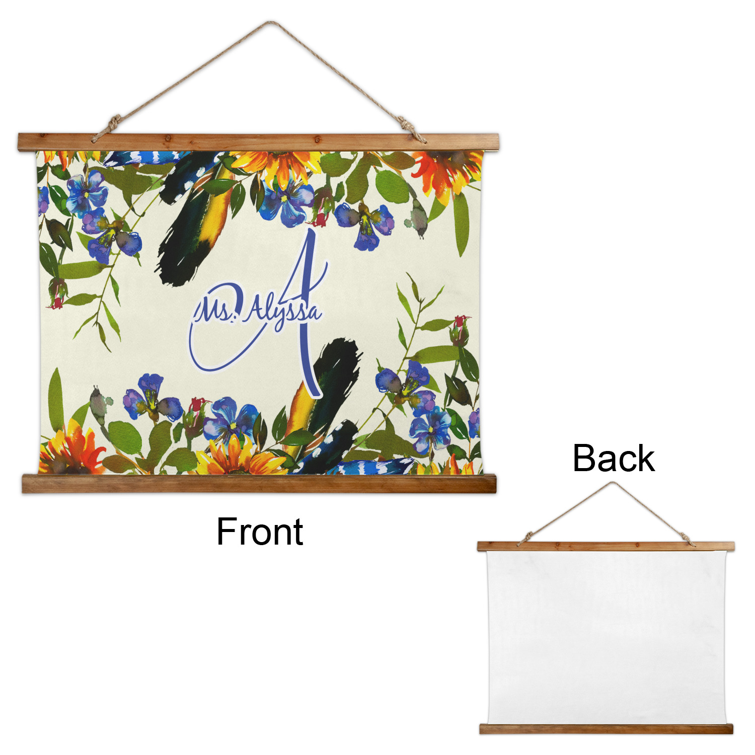 Made in two different orientations - portrait or landscape - both are 26" x 36". Your design is printed on a high quality polyester fabric with hemmed edges. The wood on the top and bottom of the tapestry is 1.25" tall and 0.25" thick and there are two pieces on top and bottom which sandwich the fabric.