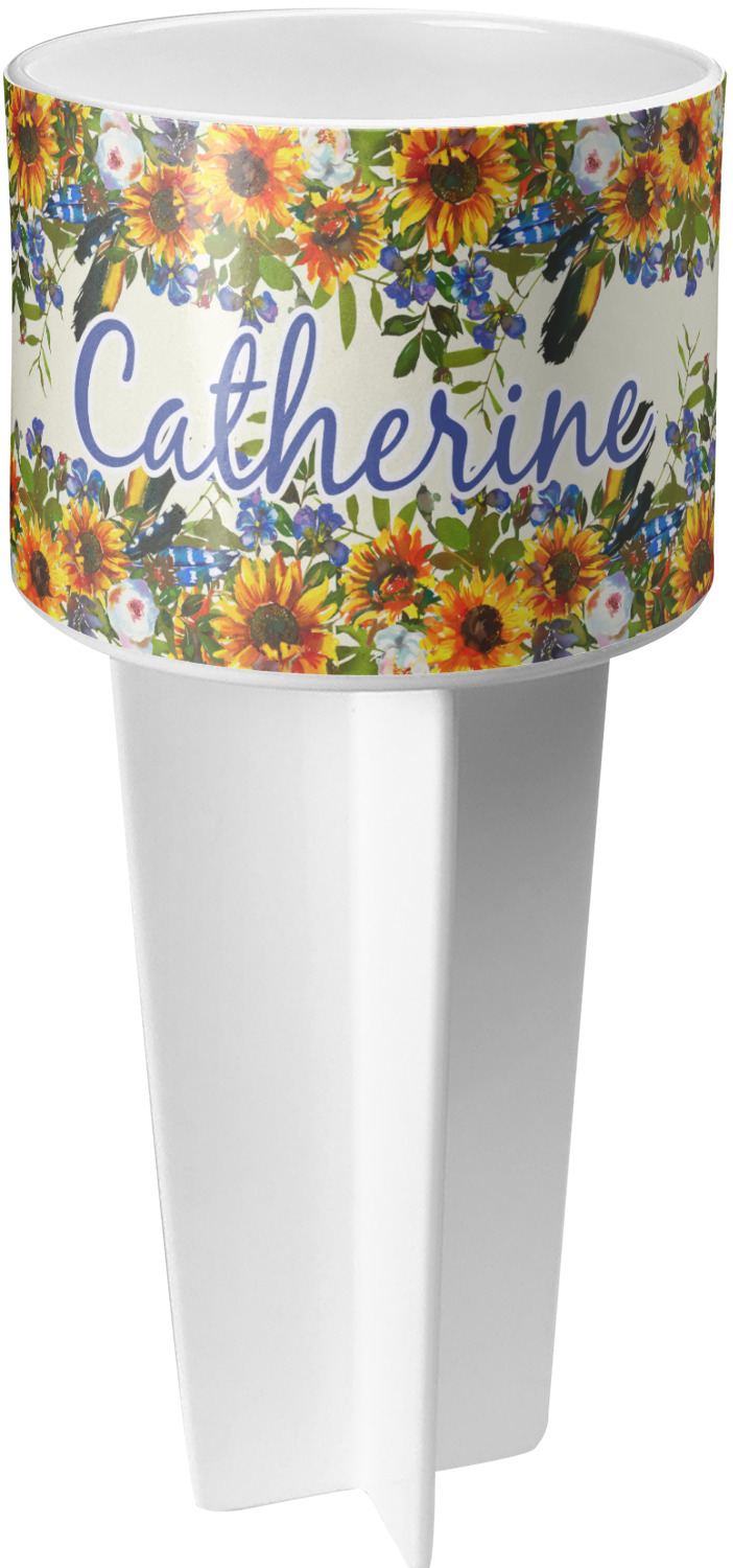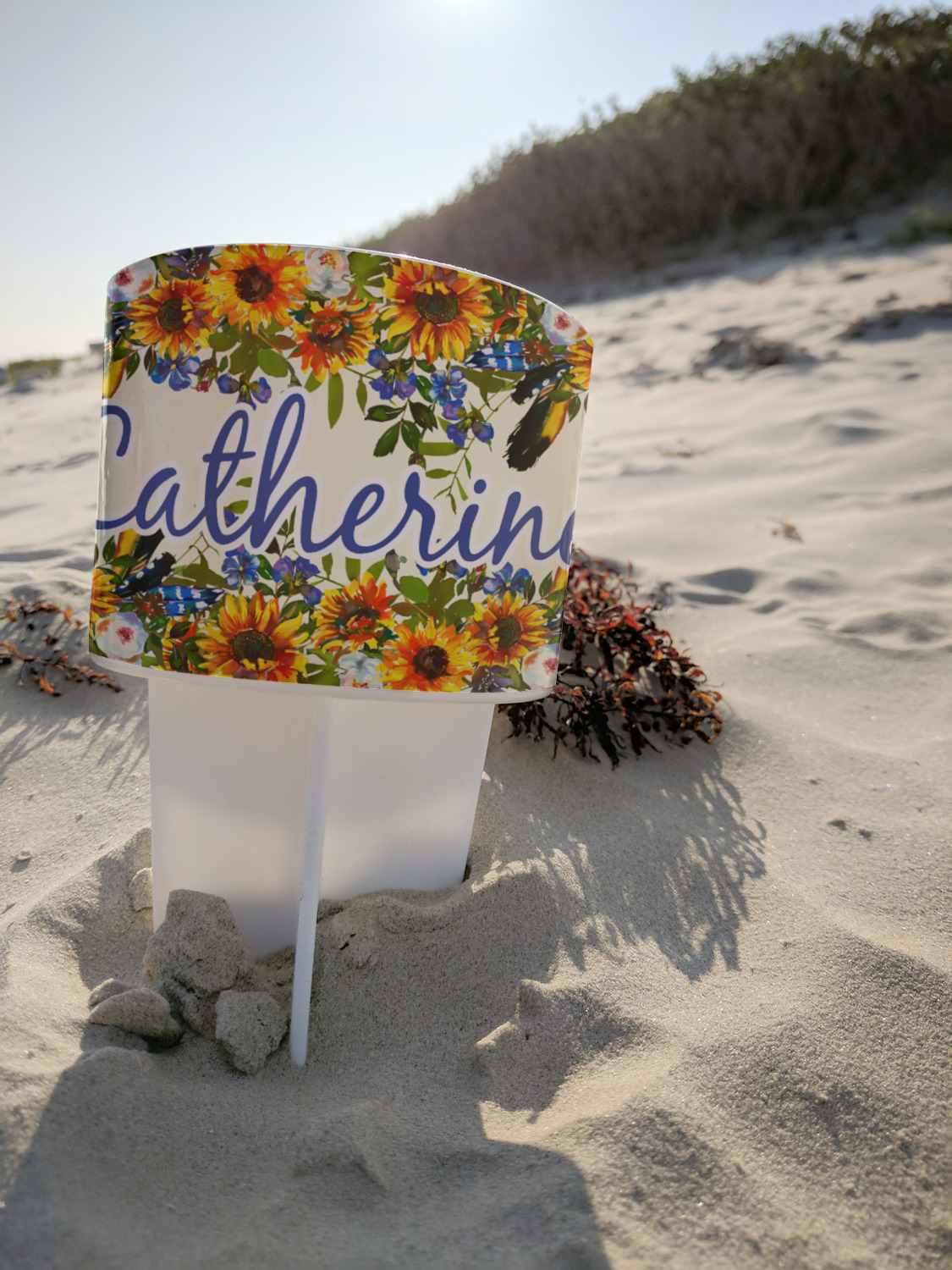 This cup holder has a large stake at its bottom that anchors it to the sand or ground below, while the cup holder rests above the stake. The entire drink holder is made of durable plastic and displays your customization around the cup holder portion. We sell these personalized beach spikers in two different colors: black and white.