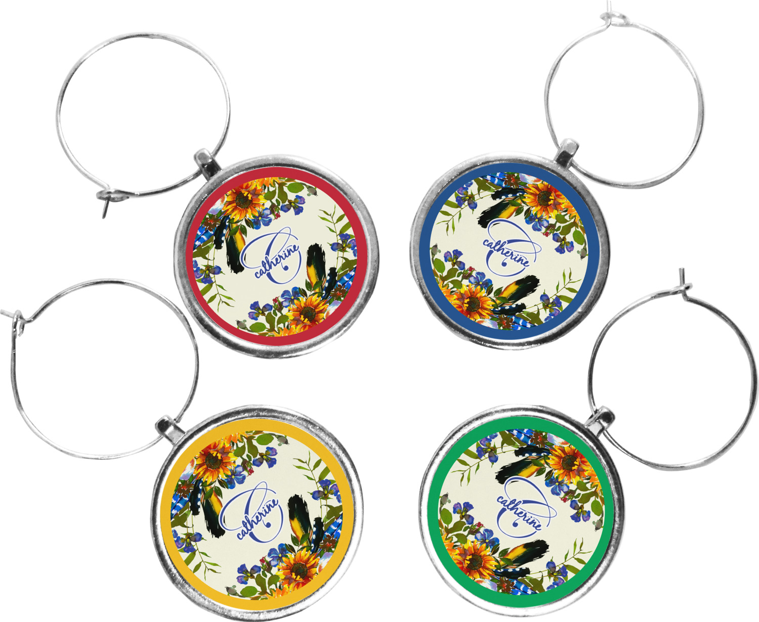 Your wine glass markers are comprised of a circular zinc plate with a 1.25 inch diameter. The zinc plate hangs from a zinc loop, which can be easily secured and removed from the stem of a wine glass. Your customized design is printed onto a 1 inch diameter insert, and then placed into the wine glass charm itself. Though sold in a set of four, you can personalize each charm individually and change the colors of the ring around your design, depending on your needs.