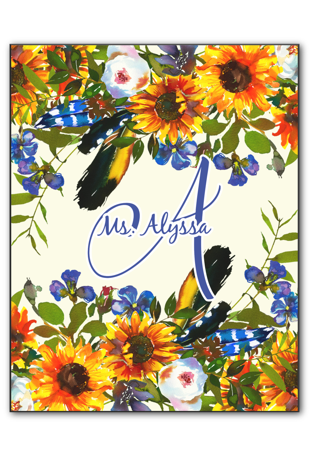 This sunflowers design template is simply beautiful. We chose to personalize it with a name & initial for the main design. We used the blue from the flower in the design and a really pale yellow background.