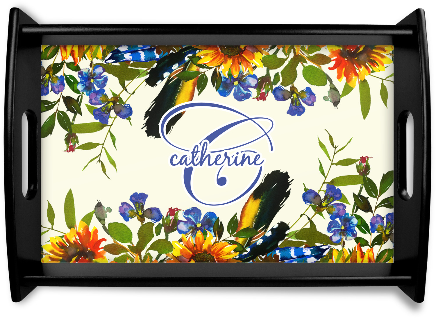 This serving tray with handles features square edges and two rounded sides, creating a very modern look. Each side is fabricated from a beautifully cut, natural wood. The bottom of the interior of the tray displays your customized design in bright, vibrant color. The tray is sold in both a black color and a natural wood look. Each variation of the wood serving tray has two sizes: Small, which is 14" x 10" x 2.25", and Large, which is 19.5" x 13.5" x 2.75".