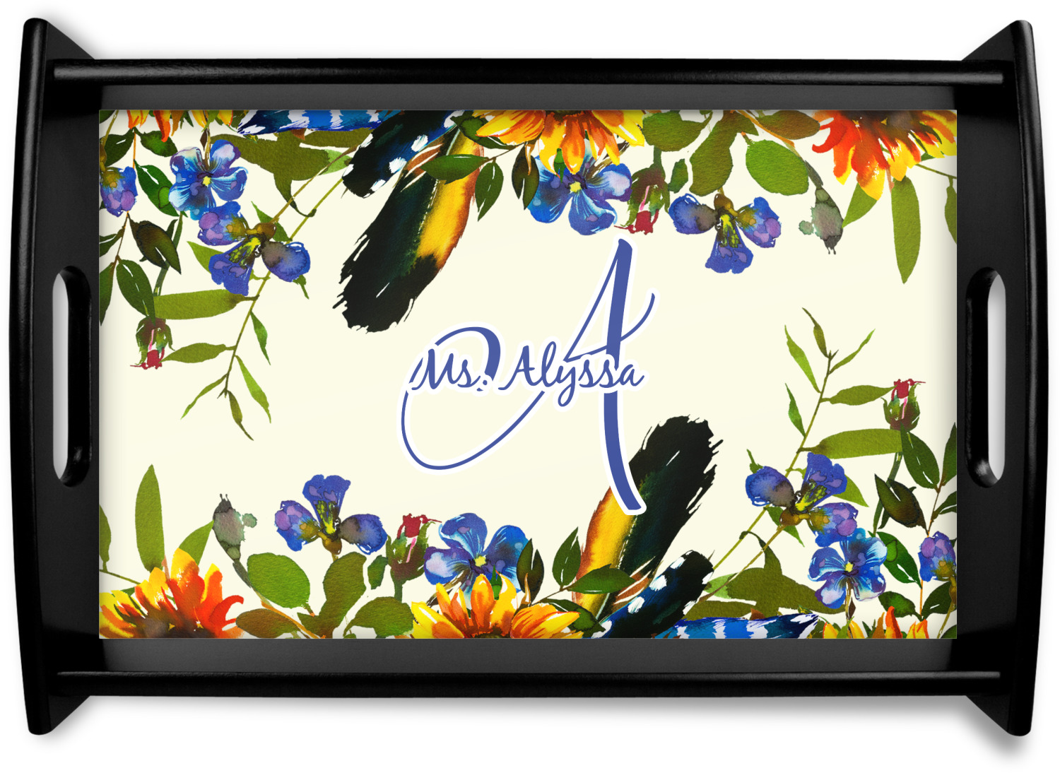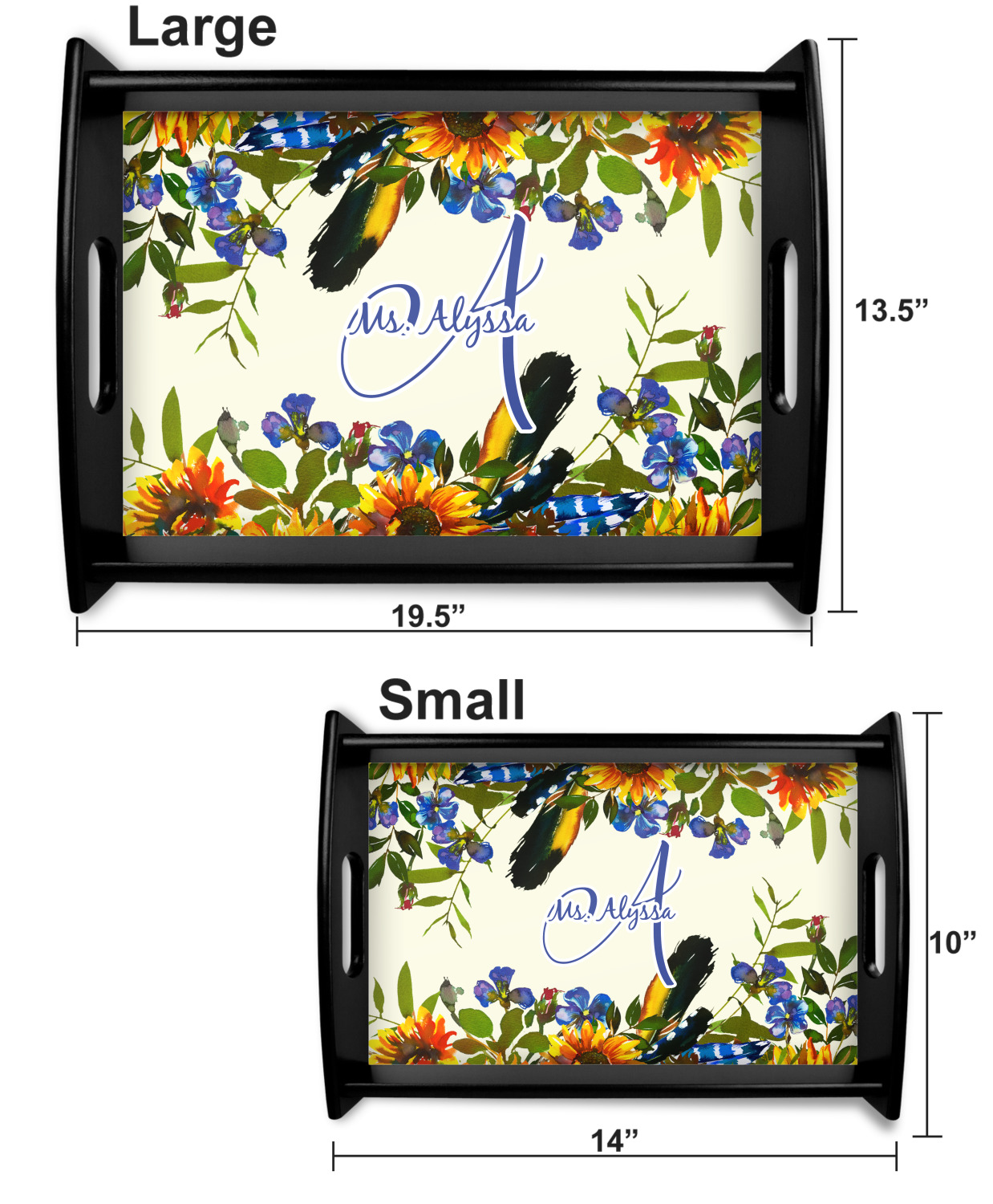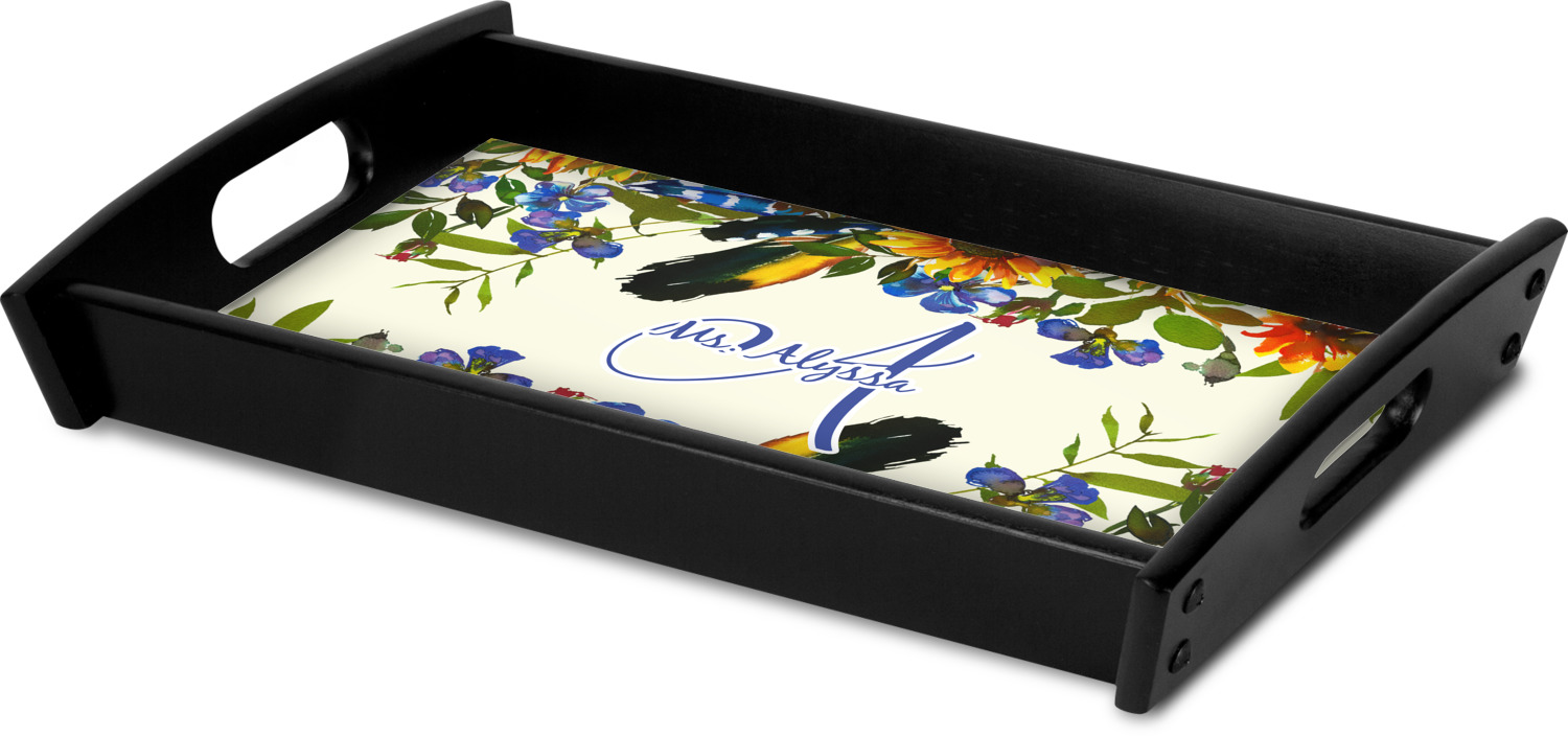 This serving tray with handles features square edges and two rounded sides, creating a very modern look. Each side is fabricated from a beautifully cut, natural wood. The bottom of the interior of the tray displays your customized design in bright, vibrant color. The tray is sold in both a black color and a natural wood look. Each variation of the wood serving tray has two sizes: Small, which is 14" x 10" x 2.25", and Large, which is 19.5" x 13.5" x 2.75".