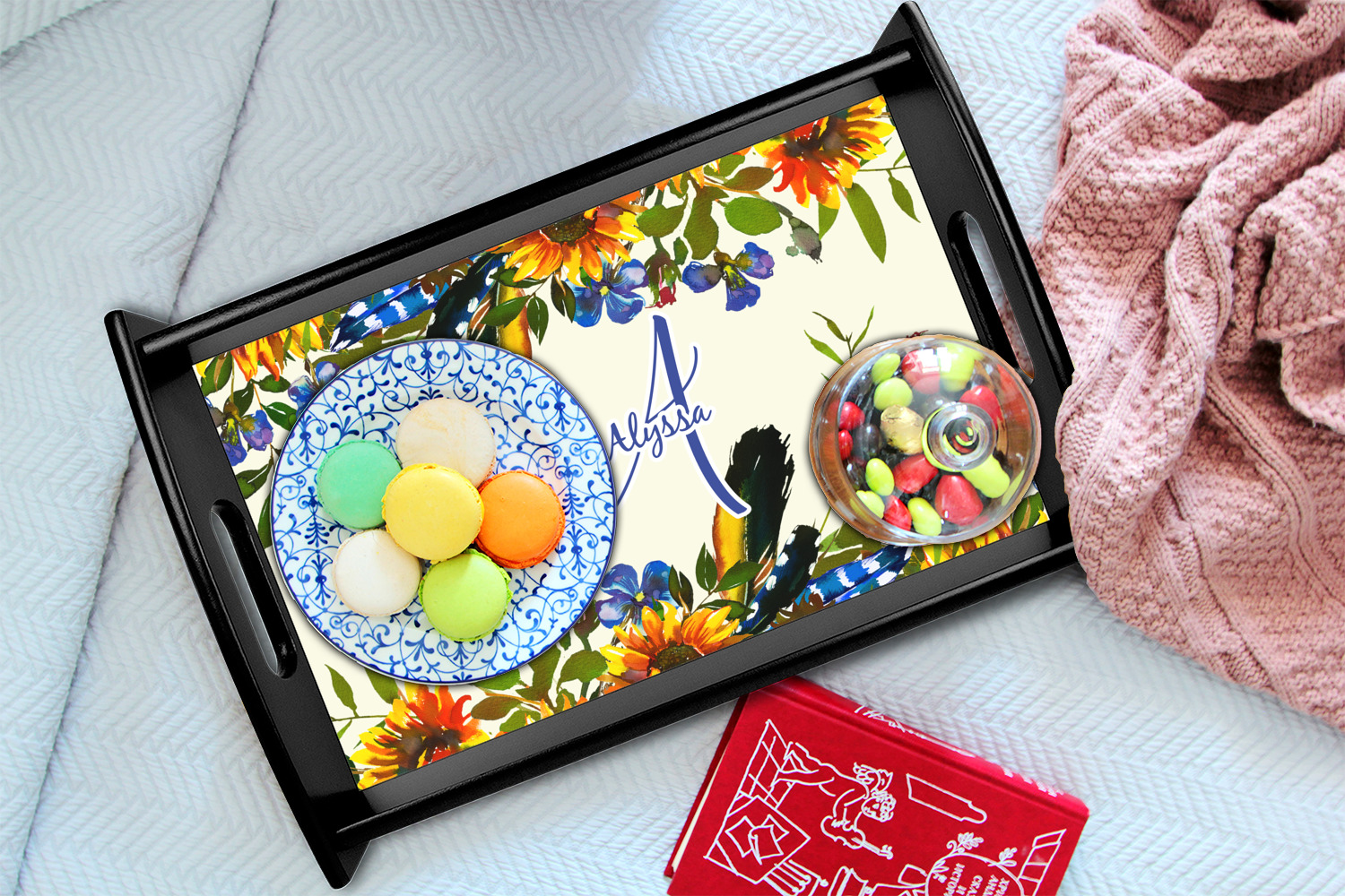 This sunflowers design template is simply beautiful. We chose to personalize it with a name & initial for the main design. We used the blue from the flower in the design and a really pale yellow background.
