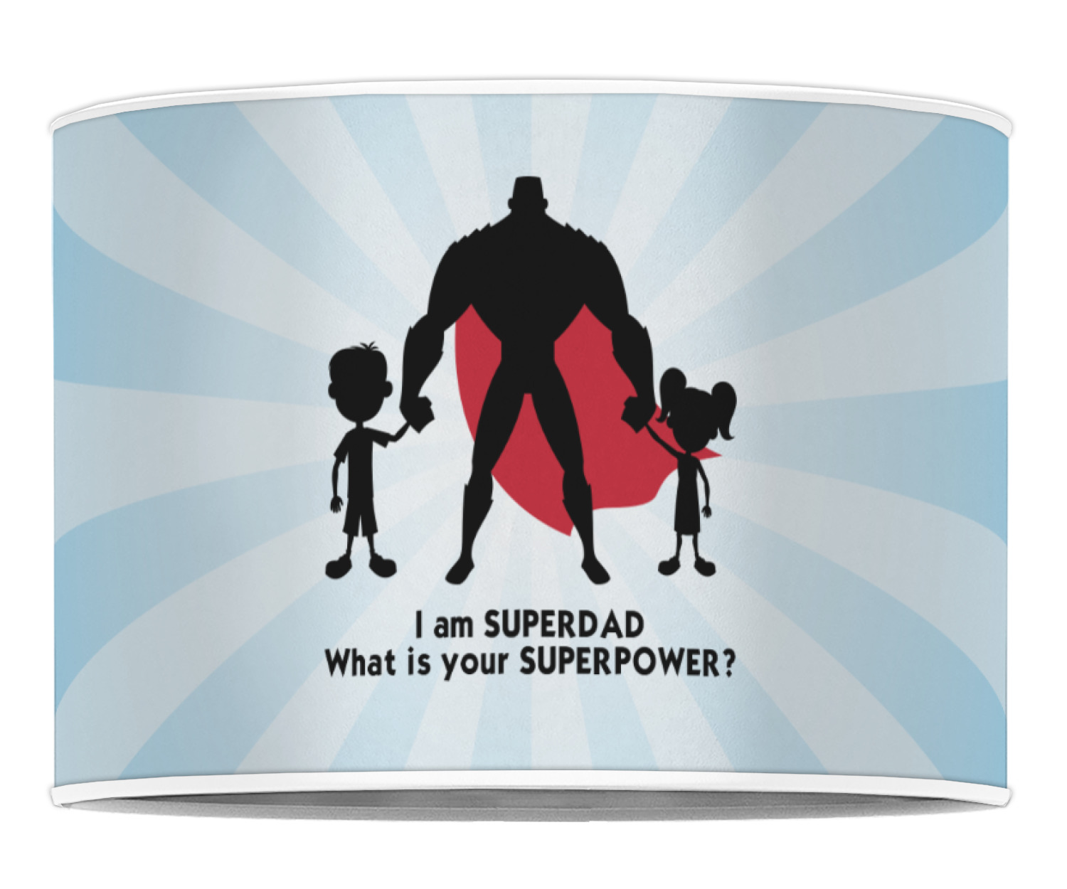 Our dads are our superheroes and this super dad design reflects that. Our design depicts a superhero male holding hands with a little boy and girl. Our super hero dad is wearing a red cape. We used a starburst in blue to really highlight our superhero dad!
