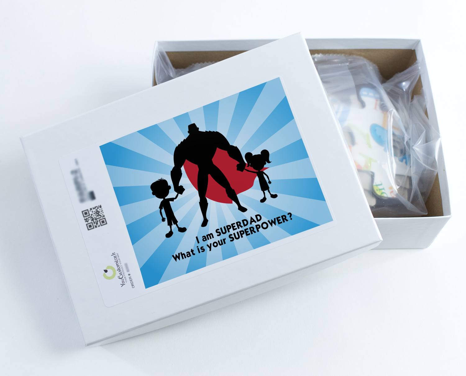 Our customization and rendering system allows you to customize and personalize the design to your liking. You are able to change the colors on the starburst, the colors of the graphic and of course the cape. We chose to use the text "I am a super dad. What is your super power?"; you can use whatever text you like.
