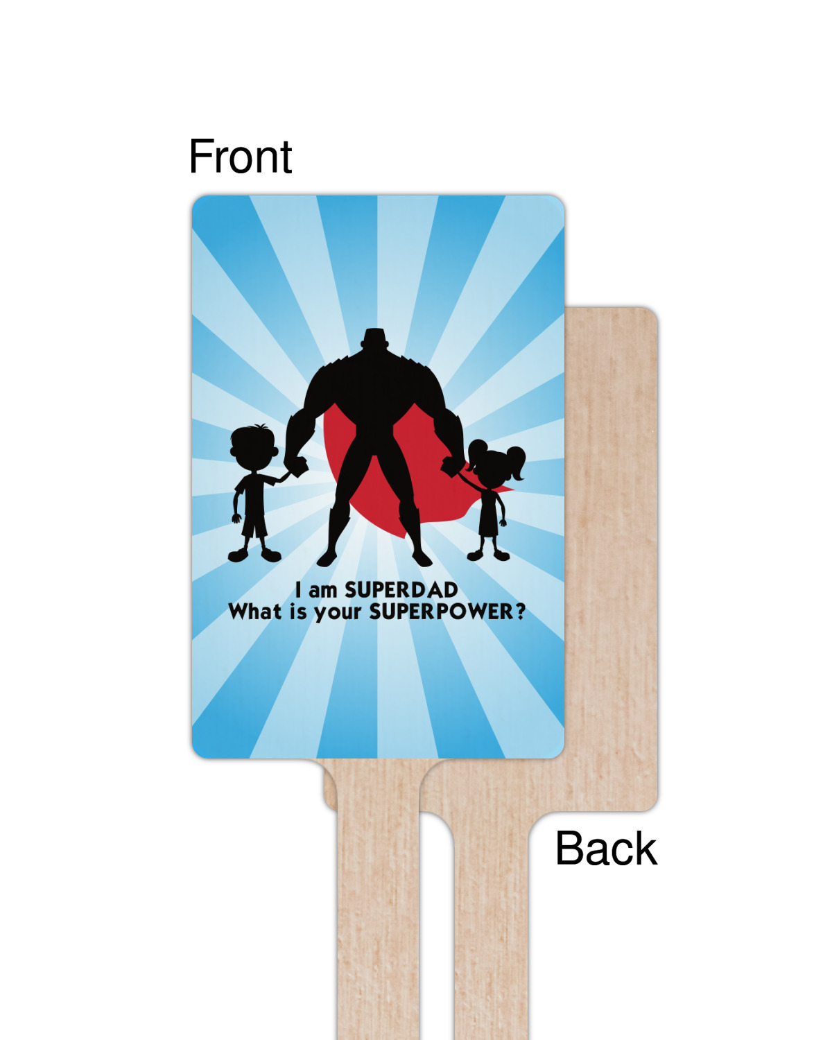 Our dads are our superheroes and this super dad design reflects that. Our design depicts a superhero male holding hands with a little boy and girl. Our super hero dad is wearing a red cape. We used a starburst in blue to really highlight our superhero dad!