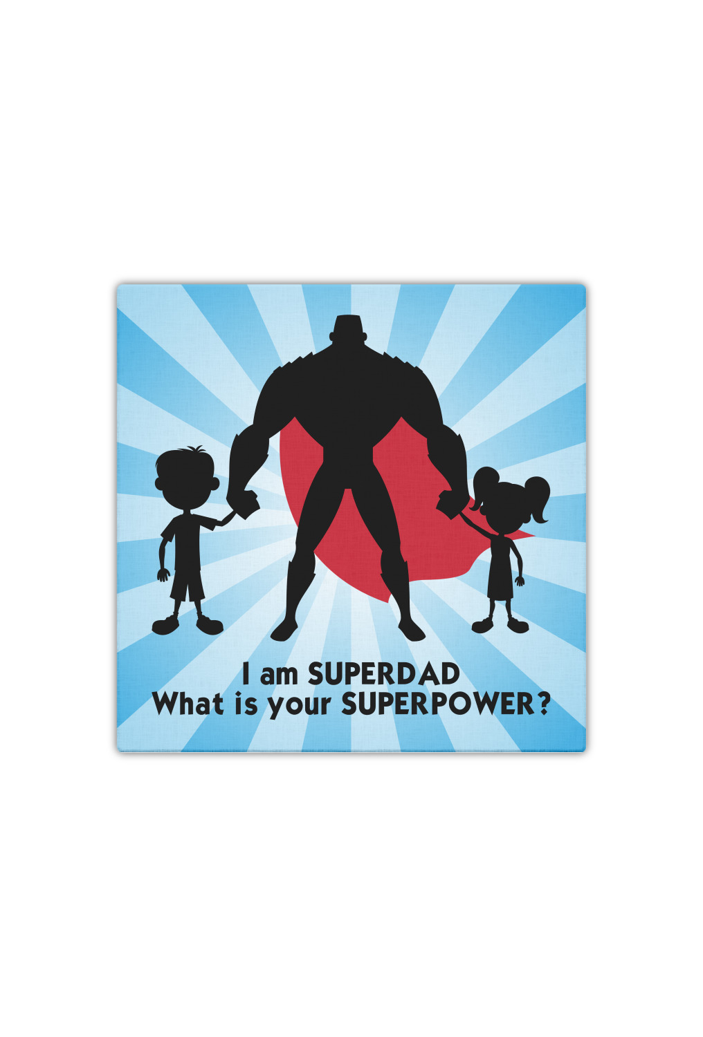 Our dads are our superheroes and this super dad design reflects that. Our design depicts a superhero male holding hands with a little boy and girl. Our super hero dad is wearing a red cape. We used a starburst in blue to really highlight our superhero dad!