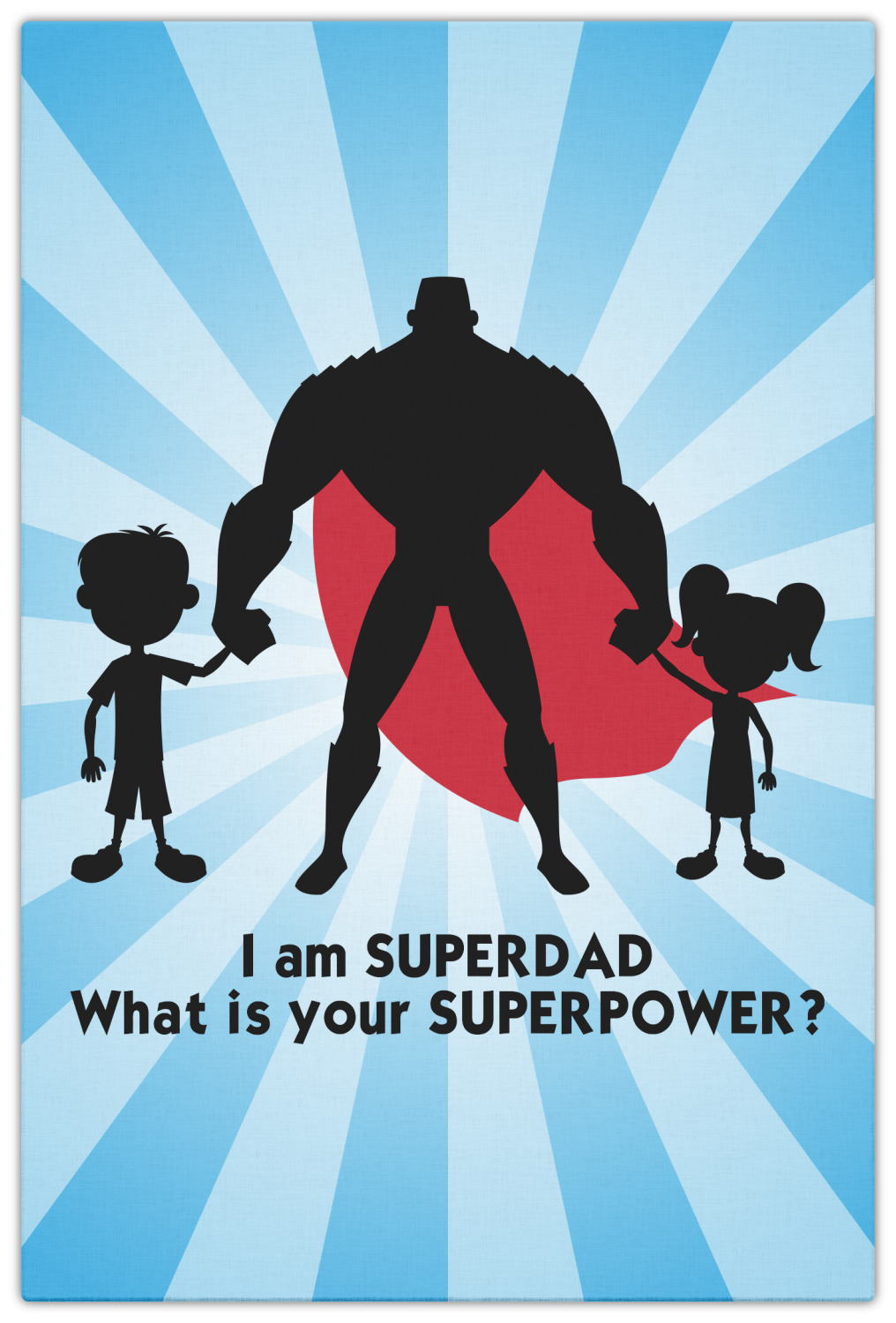 Our dads are our superheroes and this super dad design reflects that. Our design depicts a superhero male holding hands with a little boy and girl. Our super hero dad is wearing a red cape. We used a starburst in blue to really highlight our superhero dad!